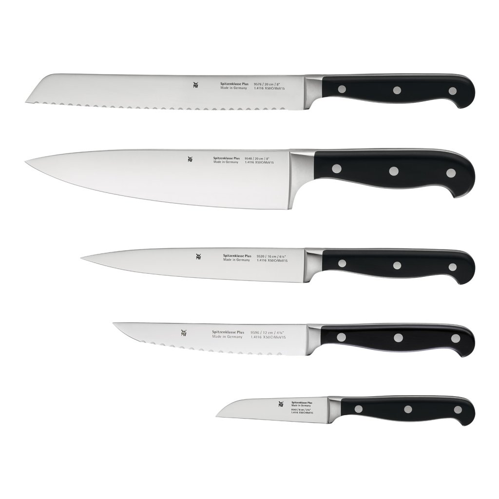 Die Messerserie Spitzenklasse Plus des deutschen Unternehmens WMF folgt der traditionellen Messerserie Spitzenklasse, die ein Klassiker unter den Küchenmessern ist. Die genieteten Griffe aus hochwertigem Spezialkunststoff haben abgerundete Kanten und sind im Gegensatz zu den Vorgängerserien sehr angenehm zu greifen. Selbstverständlich verfügen solche hochwertigen Messer auch über eine perfekte Verklebung der Einzelteile, die das Festsetzen von Ablagerungen und Bakterien verhindert.