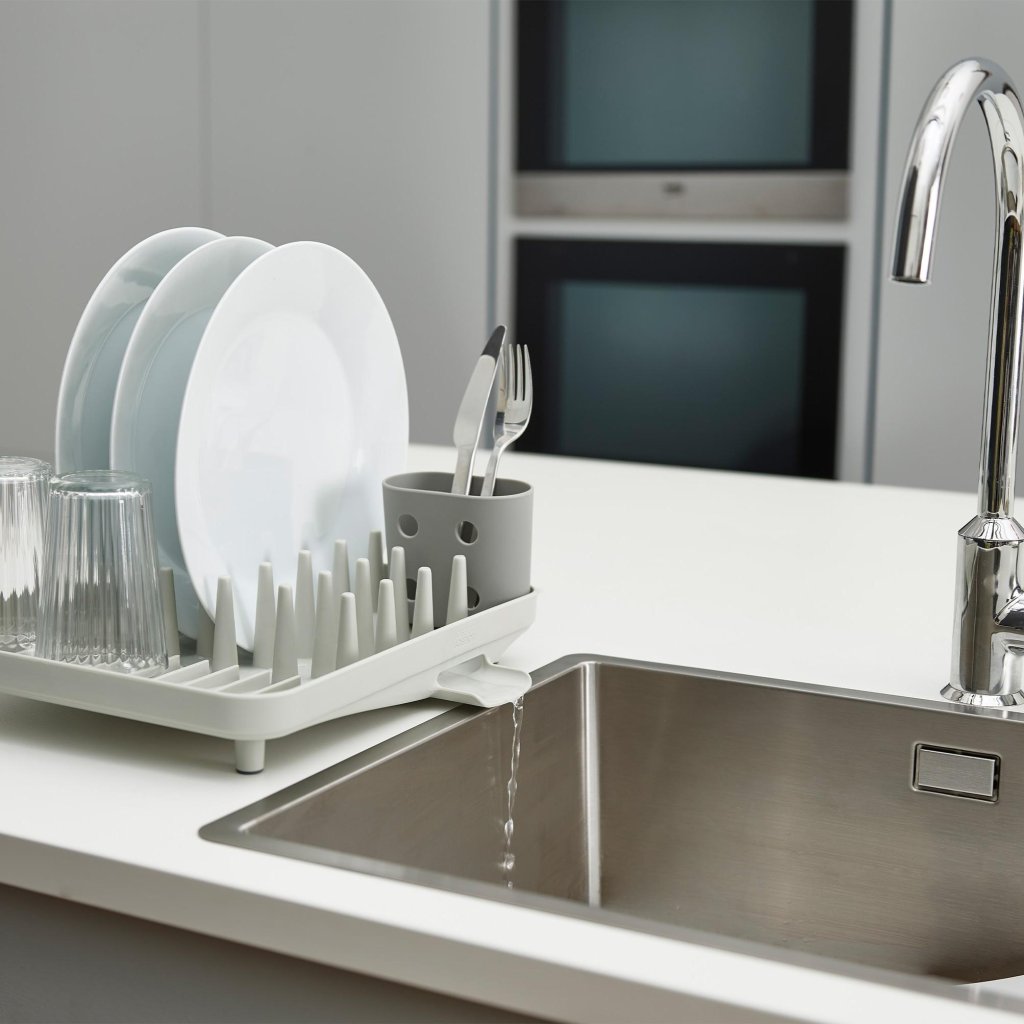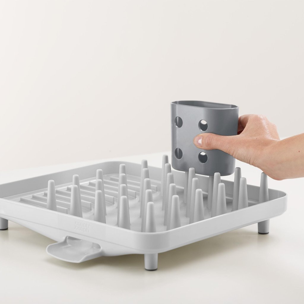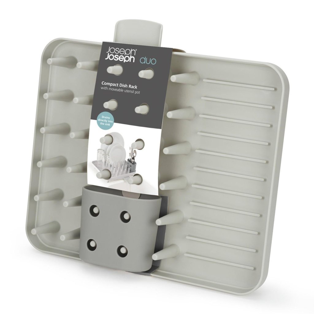 - Der kompakte Joseph Joseph DUO Geschirrabtropfständer ist eine praktische Lösung für das tägliche Abtropfen von Geschirr in kleineren Küchen oder dort, wo Platz auf der Arbeitsplatte gespart werden muss.