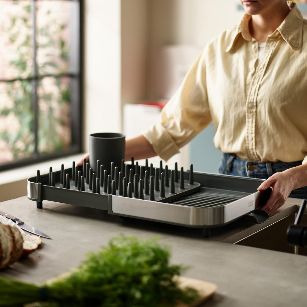 - Der ausziehbare Joseph Joseph DUO Abtropfständer ist ein praktischer Helfer für das tägliche Abtropfen von Geschirr und ermöglicht eine bequeme Anpassung des Platzes an die aktuellen Bedürfnisse deiner Küche.