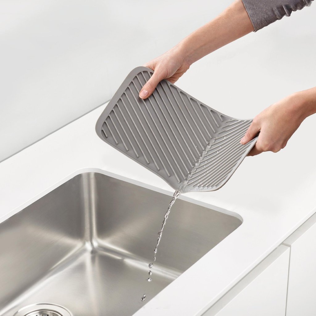 - Die Joseph Joseph DUO Abtropfmatte ist eine praktische Lösung für Momente, in denen Sie zusätzlichen Platz auf der Arbeitsfläche zum Trocknen von Geschirr schaffen müssen.