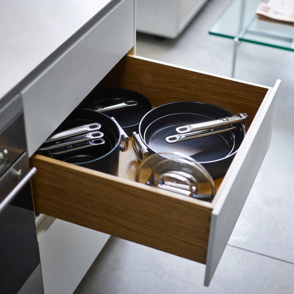 - Durch das Umklappen des Griffs lassen sich bis zu 50 % des Stauraums einsparen, was besonders in kleineren Küchen mit wenig Platz von Vorteil ist.