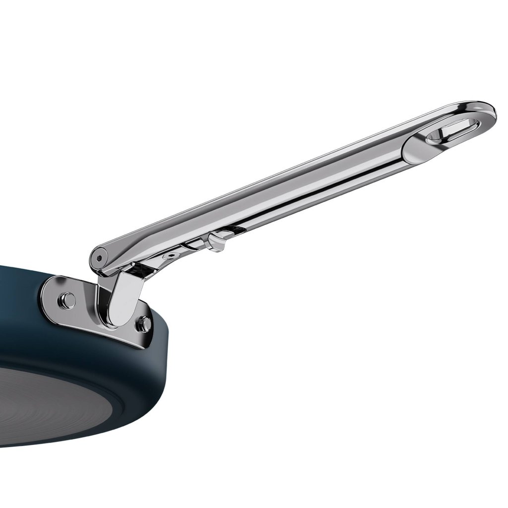 - Mit der patentierten SwingLock™-Technologie verfügt er über einen klappbaren Edelstahlgriff, der das kompakte Stapeln in Schubladen und Schränken ermöglicht.