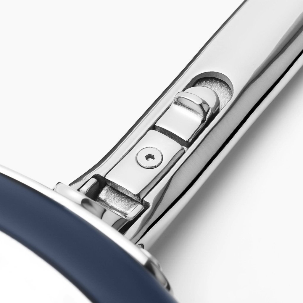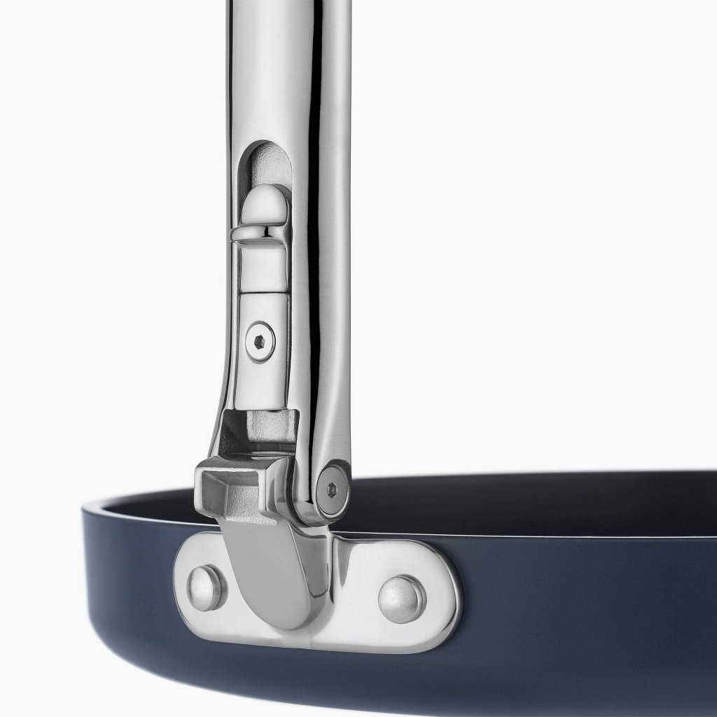 - Mit der patentierten SwingLock™-Technologie verfügt er über einen klappbaren Edelstahlgriff, der das kompakte Stapeln in Schubladen und Schränken ermöglicht.