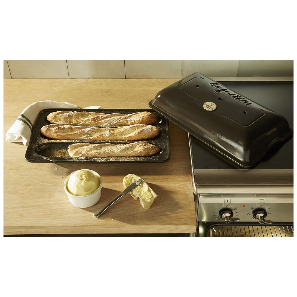 Weil die Perfektion des französischen Baguettes im Backen liegt, widmeten die Designer Emile Henry viele Jahre der Entwicklung der Form. Die so entstandene Form simuliert perfekt die Umgebung eines Keramikbackofens. Die anfängliche Feuchtigkeit, die zu Beginn des Backens entsteht, entweicht langsam durch die Löcher in der Oberseite der Form, und zwar genau in der Menge, die für eine weiche Krume und eine knusprige Kruste erforderlich ist. Das beste Baguette und der Grad seiner Knusprigkeit können auch nach Gehör beurteilt werden.