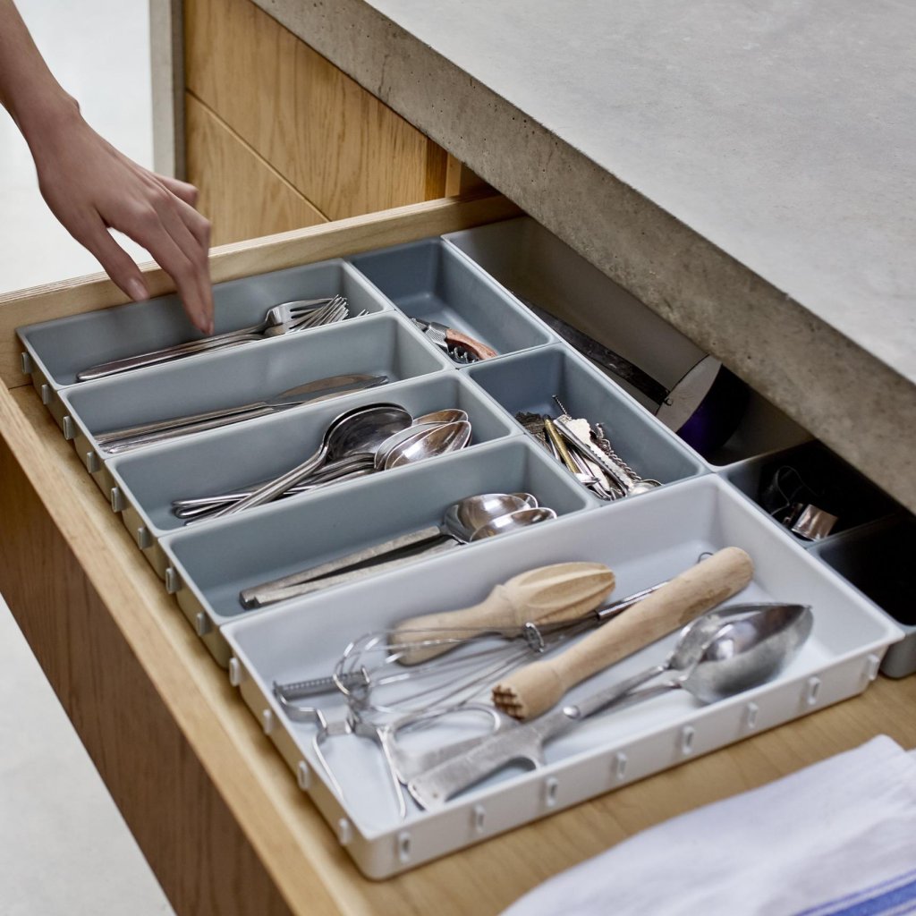 - Die modulare Konstruktion ermöglicht die Kombination einzelner Teile nach Bedarf und die Anpassung des Organizers an verschiedene Schubladentypen in der Küche, im Büro oder in der Werkstatt.