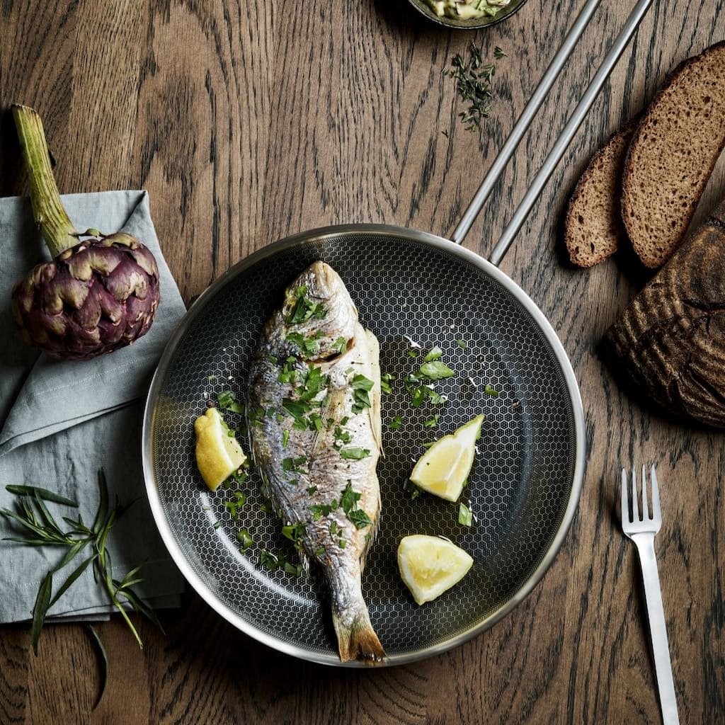 - der Pfannenkörper besteht aus recyceltem Edelstahl und Aluminium, was eine hohe Beständigkeit und lange Lebensdauer garantiert