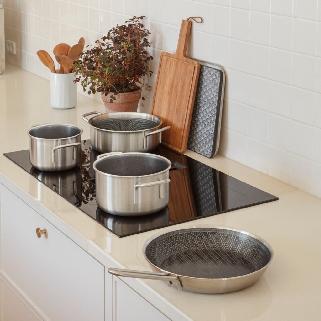 - die Oberfläche ist kratzfest und ermöglicht die sichere Verwendung von Küchenwerkzeugen aus Metall ohne Beschädigung