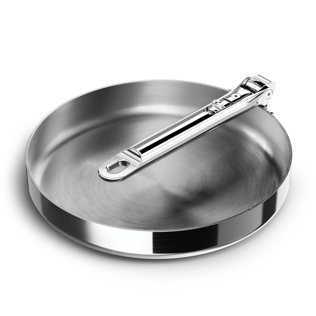 - Der robuste dreischichtige Aufbau kombiniert eine polierte Edelstahlaußenfläche, einen Aluminiumkern für gleichmäßige Wärmeverteilung und eine matte Edelstahlinnenfläche.
