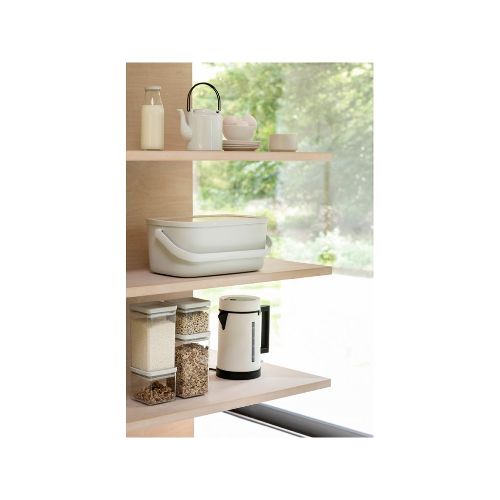 Egal, ob man mit der Familie schlemmt oder sich allein eine gemütliche Mahlzeit gönnt, der BrabantiaNothing Brotkasten macht den Tisch zum Picknick. Er hat einen schönen Bambusdeckel, der auch als Schneidebrettdient, und einen praktischen Tragegriff, damit du ihn zum Tisch oder zu einem Picknick im Garten mitnehmen kannst. Es passt bis zwei Brote, und wie die anderen Brottöpfe Brabantia , hat Nic einen geriffelten Boden für genau die richtige Belüftung.