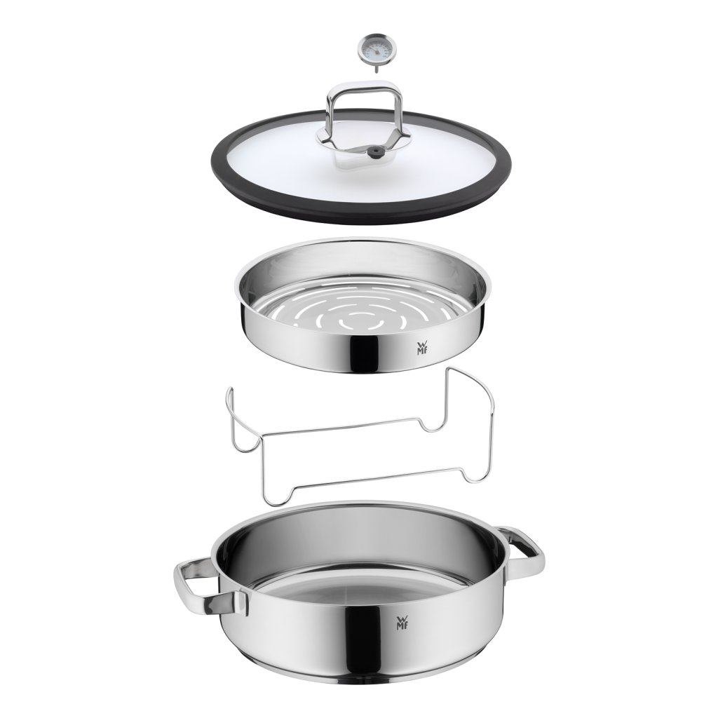 Die Vitalis WMF Aroma-Dampfkasserolle mit einem Durchmesser von 28 cm und einem Volumen von 5 Litern aus poliertem Cromargan®-Edelstahl bildet zusammen mit dem Aroma-Dampfeinsatz und einem Glasdeckel mit Silikondichtung und integriertem Thermometer das perfekte Set zum Dämpfen.
