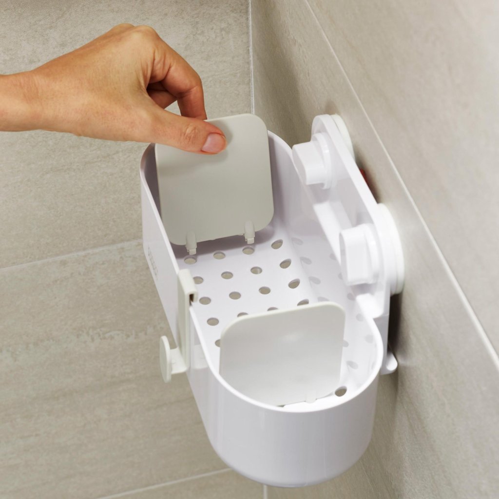 - Der Behälter ist aus strapazierfähigem Kunststoff gefertigt, der für die feuchte Umgebung im Badezimmer und in der Duschkabine geeignet ist.