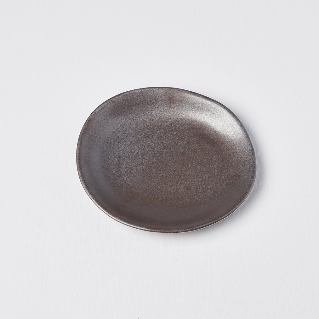 Der Teller ist von sehr unregelmäßiger runder Form und hat ein schönes metallisches Aussehen mit einem unregelmäßigen Rand.