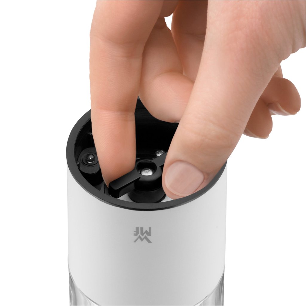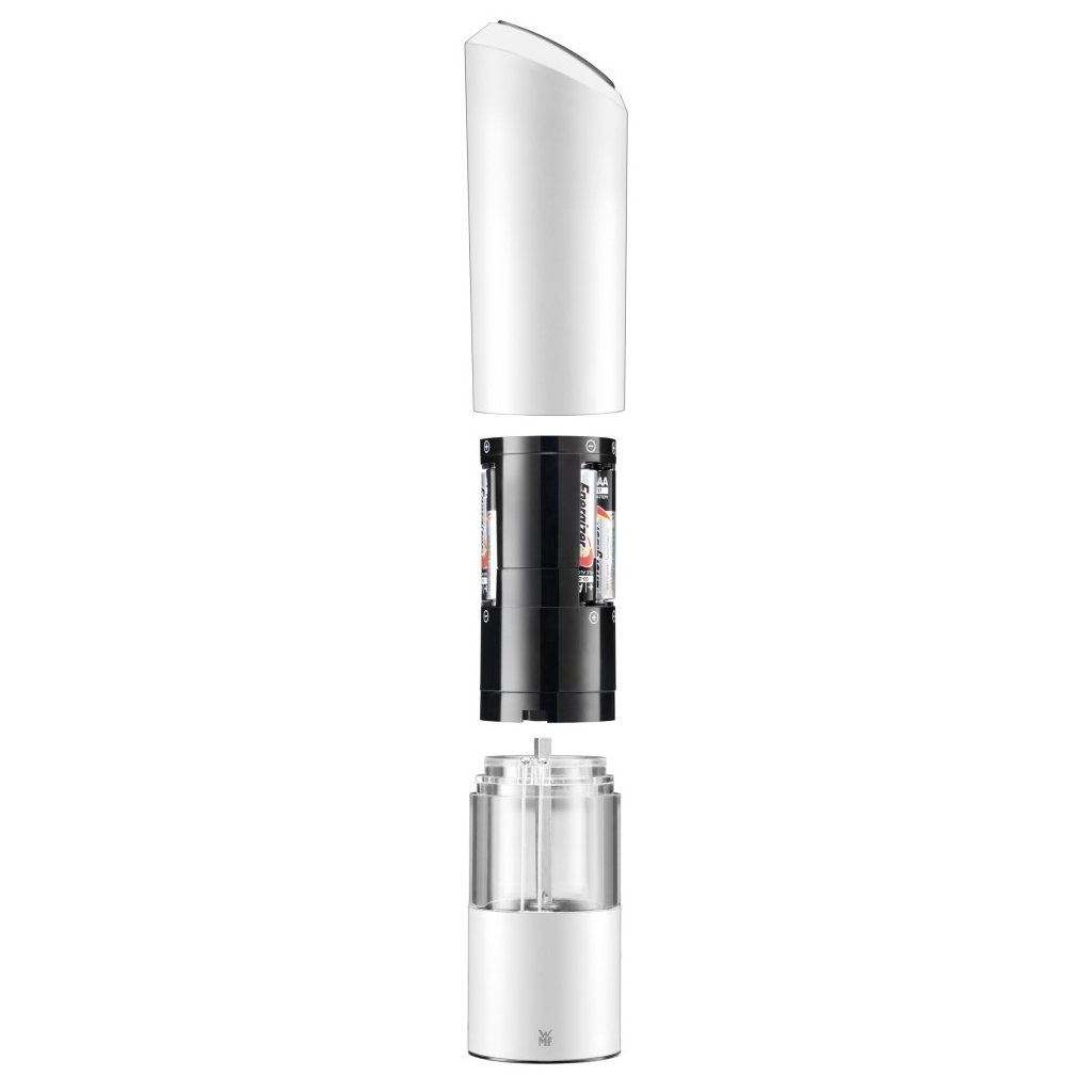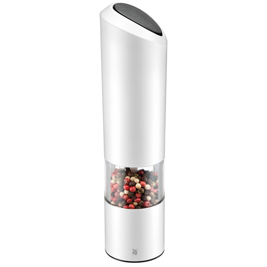 Die elektrische Gewürzmühle ist aus hochwertigem Kunststoff und langlebigem Acrylglas gefertigt. Das Keramikmahlwerk wird von WMF für zehn Jahregarantiert.