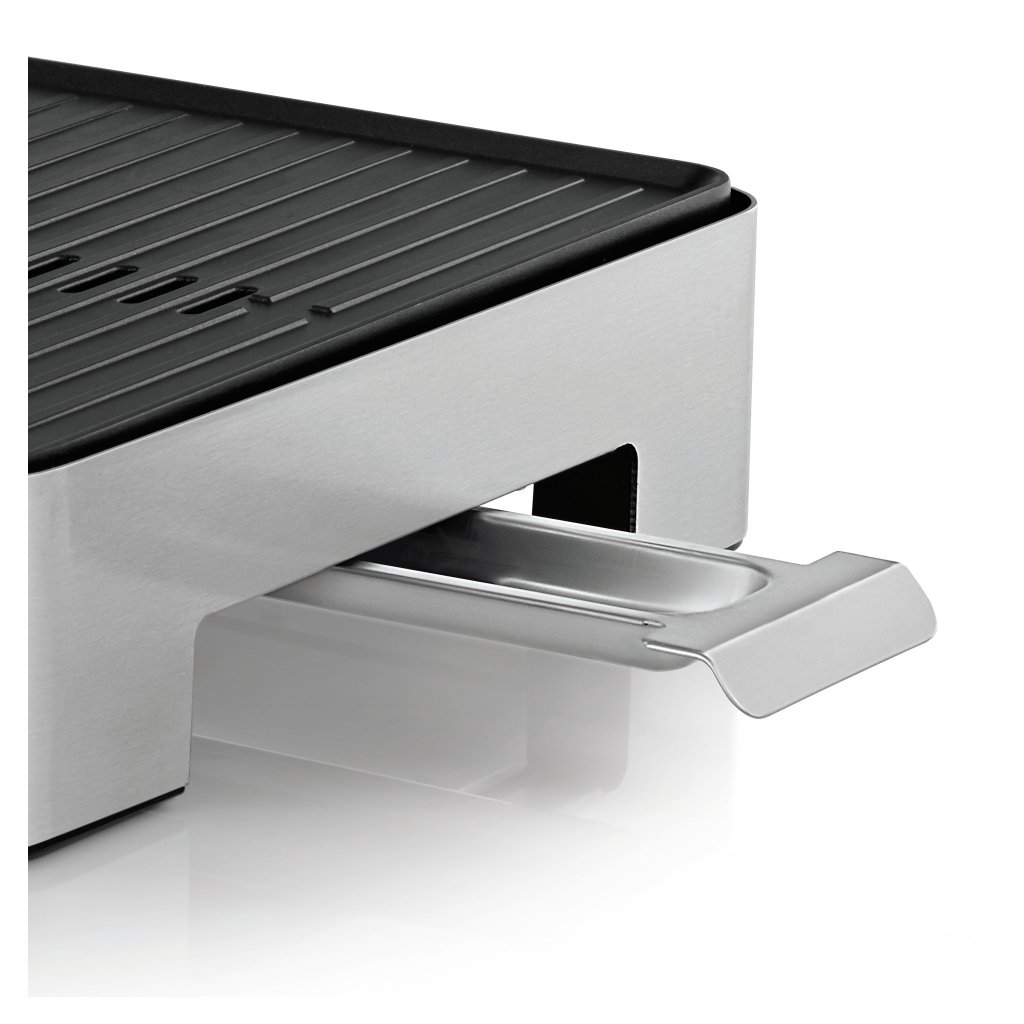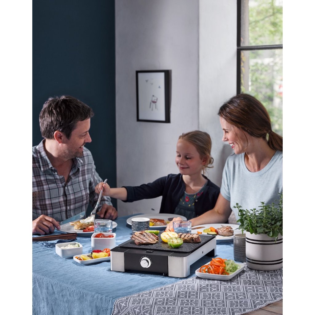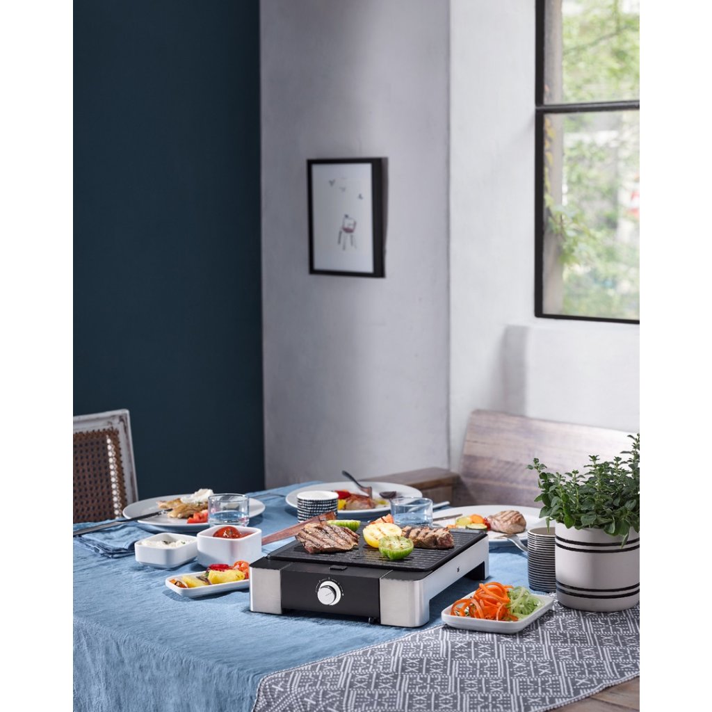 Der leistungsstarke LONO Elektrogrill der deutschen Marke WMF ist aus gebürstetem Cromargan®-Edelstahl gefertigt. Zu den Vorteilen gehören eine in fünf Stufen einstellbare Grilltemperatur und eine abnehmbare Kochfläche. Sie können ihn als Grill zum Braten auf einer Fläche von 27 x 27 cm verwenden.