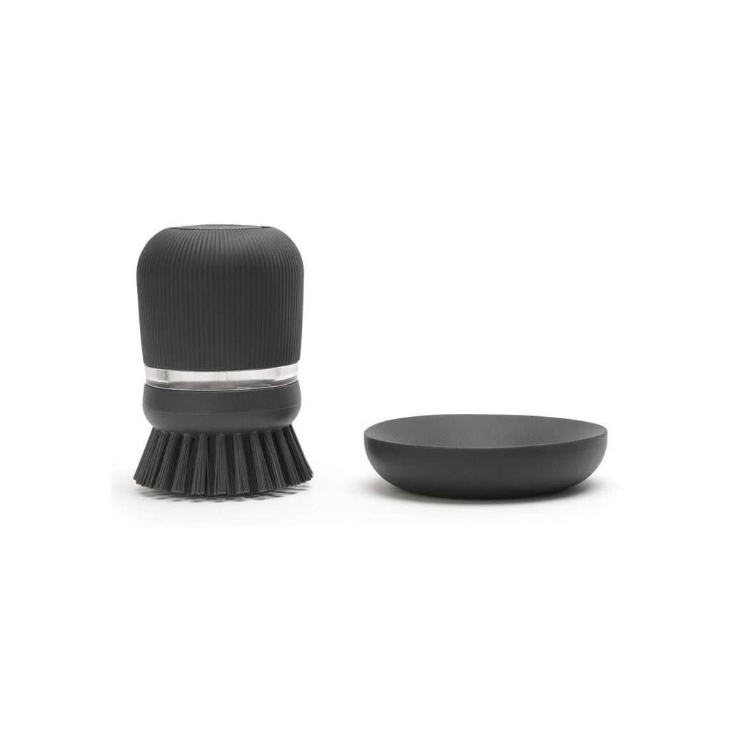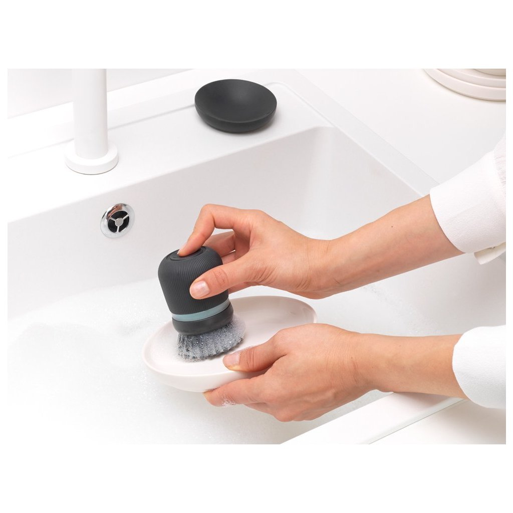 Dieses clevere Gerät macht den Abwasch ganz einfach! Drücken Sie den Knopf, um die richtige Menge an Reinigungsmittel zu dosieren. Die strapazierfähigen Nylonborsten sind hart genug zum Schrubben, aber auch weich genug, dass sie nicht kratzen. Immer zur Hand in einer sauberen Schale.