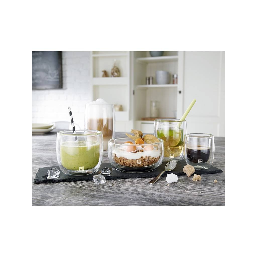 Die Gläser fallen augrund ihres auffälligen Designs auf. Die Wirkung eines kleinen Glases in einem größeren ist sowohl verspielt als auch elegant. Der Inhalt, den Sie in das Glas füllen, wird immer "luftig" wirken. Kaffee, Tee, Dessert und Vorspeisen werden im Augenblick zur Dekoration Ihres Tisches.