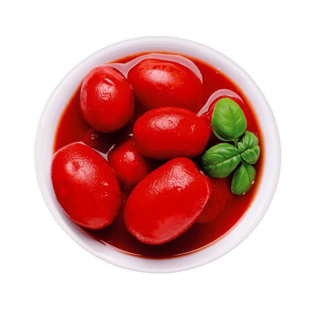 - Die Tomaten werden geschält und nur in ihrem eigenen Saft konserviert, ohne weitere Zusätze, wodurch ihr reiner Geschmack und ihr natürlicher Charakter erhalten bleiben.