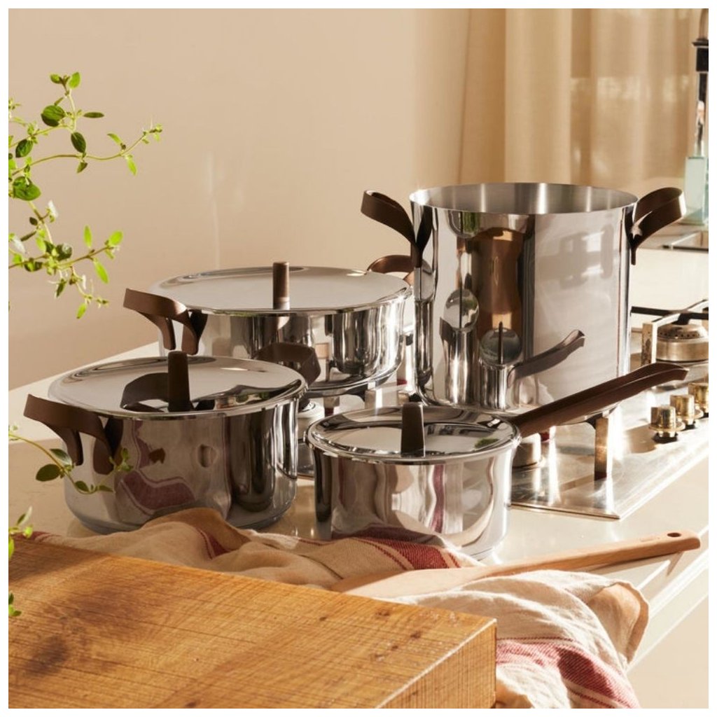 Die eleganten und stilvollen Töpfe der Kollektion EDO von der spanischen Designerin Patricia Urquiola zeichnen sich durch schlichte, minimalistische Formen aus, die durch originelle Griffe in einer einzigartigen braunen Ausführung verfeinert werden. Die Griffe der Töpfe sehen aus wie Bänder, die ans Kleid geheftet sind, und werden durch minimalistische Deckelgriffe in der gleichen Farbe ergänzt. Die Griffe sind ziemlich ungewöhnlich und stellen die perfekte Kombination aus funktionalem und schönem Design dar. Wenn Sie Töpfe suchen, die nicht wie Standardtöpfe aussehen, ist dieses Topfset definitiv etwas für Sie.