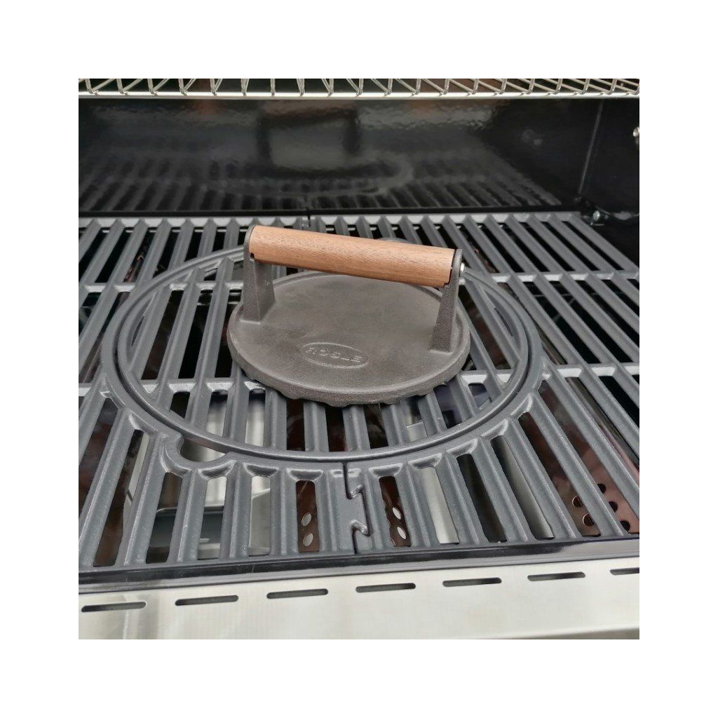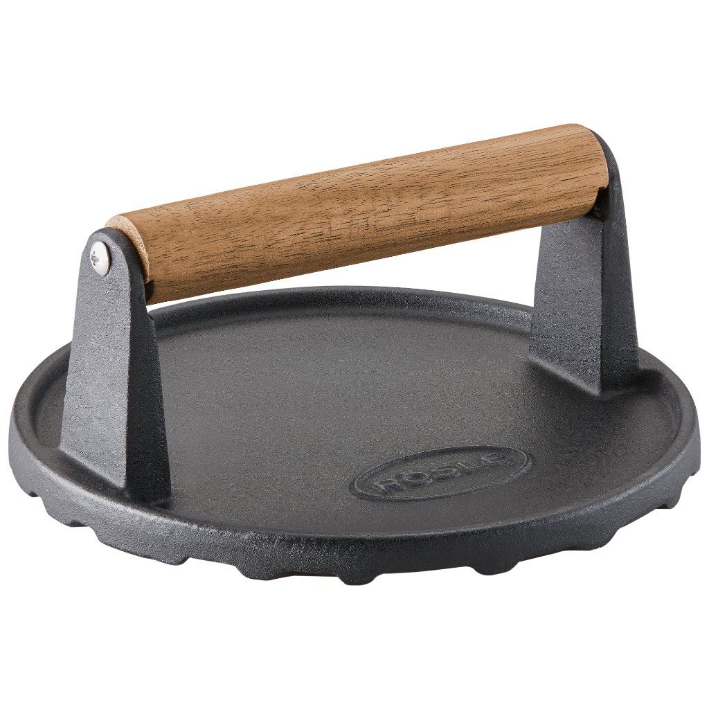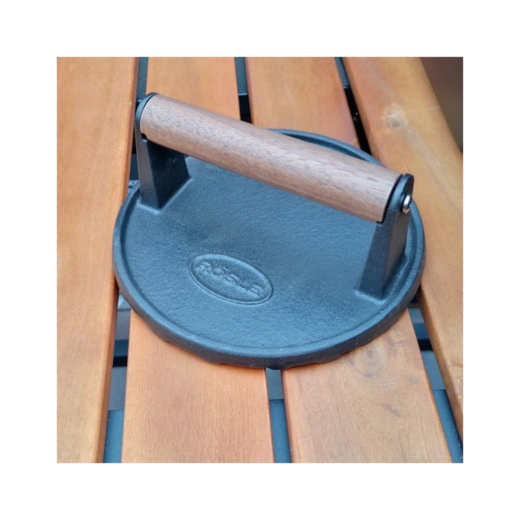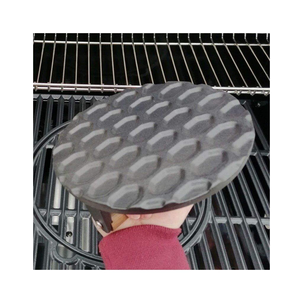 Für perfekt gebratene und gut aussehende Burger, Steaks und andere ähnliche Grillgerichte, verwenden Sie dieses emaillierte Gusseisengewicht mit Holzgriff.