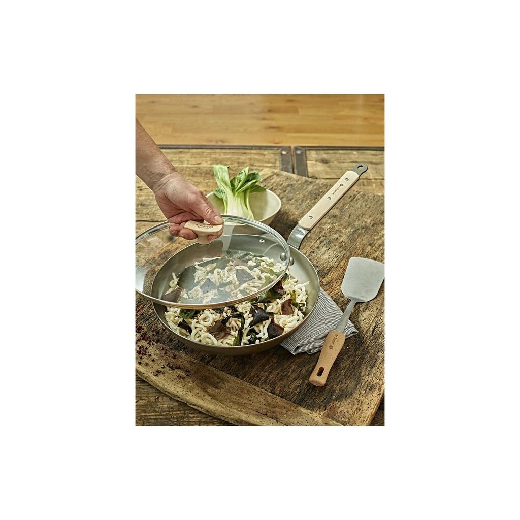 Der Glasdeckel mit 32 cm Durchmesser und Edelstahlrand eignet sich für Choc B Bois, Choc Extreme, Choc Intense und ausgewählte Mineral B Bois und Mineral B Element Pfannen (nur tiefe Pfannen). Der Griff aus Buchenholz hat eine praktische Höhe, um den Deckel zu kippen und leicht auf der Arbeitsfläche abzustellen. Es wird aus nachhaltig bewirtschafteten Wäldern hergestellt. Der Deckel ist zum langsamen Garen oder zum Warmhalten von Speisengeeignet. Es ist für Öfen bis zu 200 °C geeignet.
