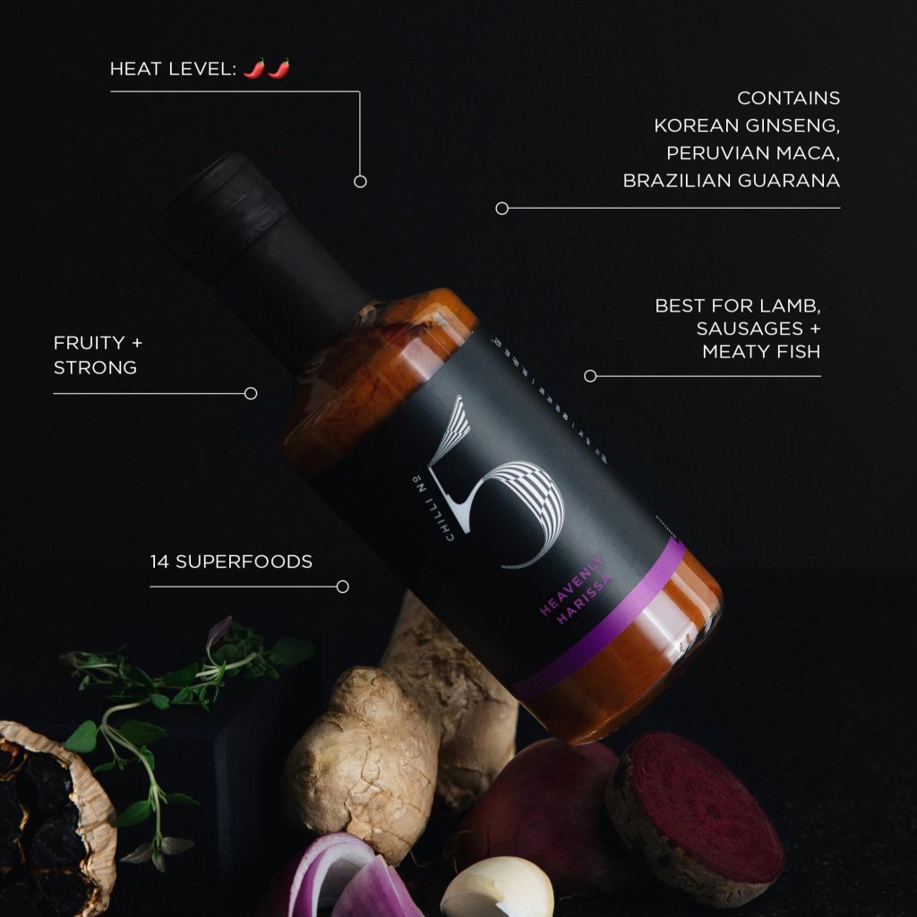 - HEAVENLY HARISSA aus Chilli No5 ist eine Gourmet-Harissa-Sauce mit einem unverwechselbaren rauchigen Geschmack und würzigen Charakter, die jedes Gericht zu einem wahren Erlebnis macht.