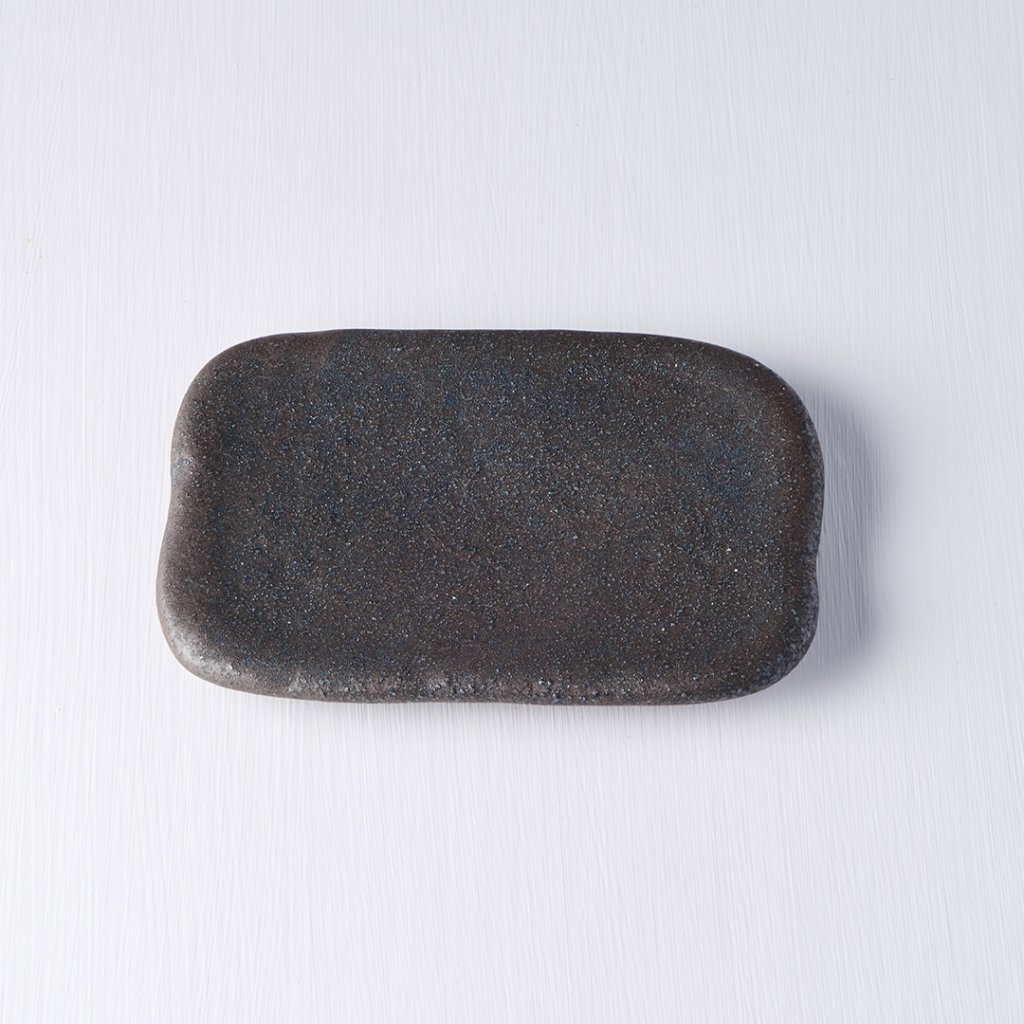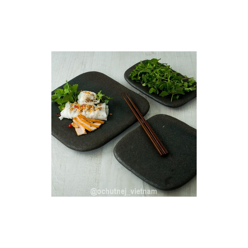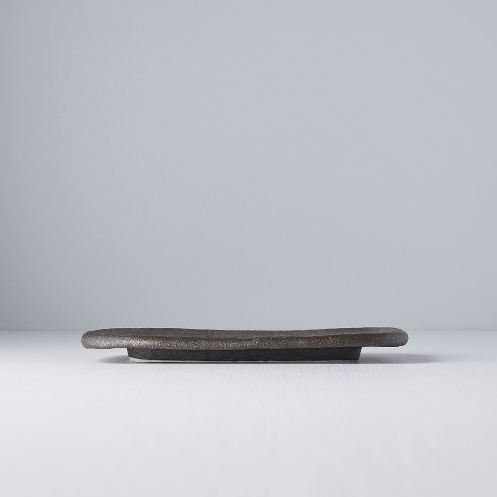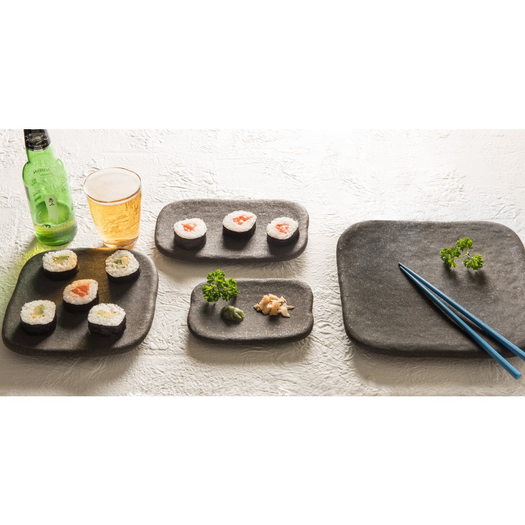 Die Steinplatte aus der Steinplatten-Kollektion hat eine rechteckige Form mit einer Größe von 22 x 13,5 x 1,8 cm. Die Farbe der Platte ist dunkelgrau bis schwarz und hat eine auffällige steinähnliche Textur. Das Brett ist handgefertigt, die Verarbeitung ist präzise und das Design ist einzigartig. Der Teller ist spülmaschinen- und mikrowellenfest. Verwenden Sie den Teller zum Servieren von kleinen Snacks wie Sushi oder tschechischen Snacks.
