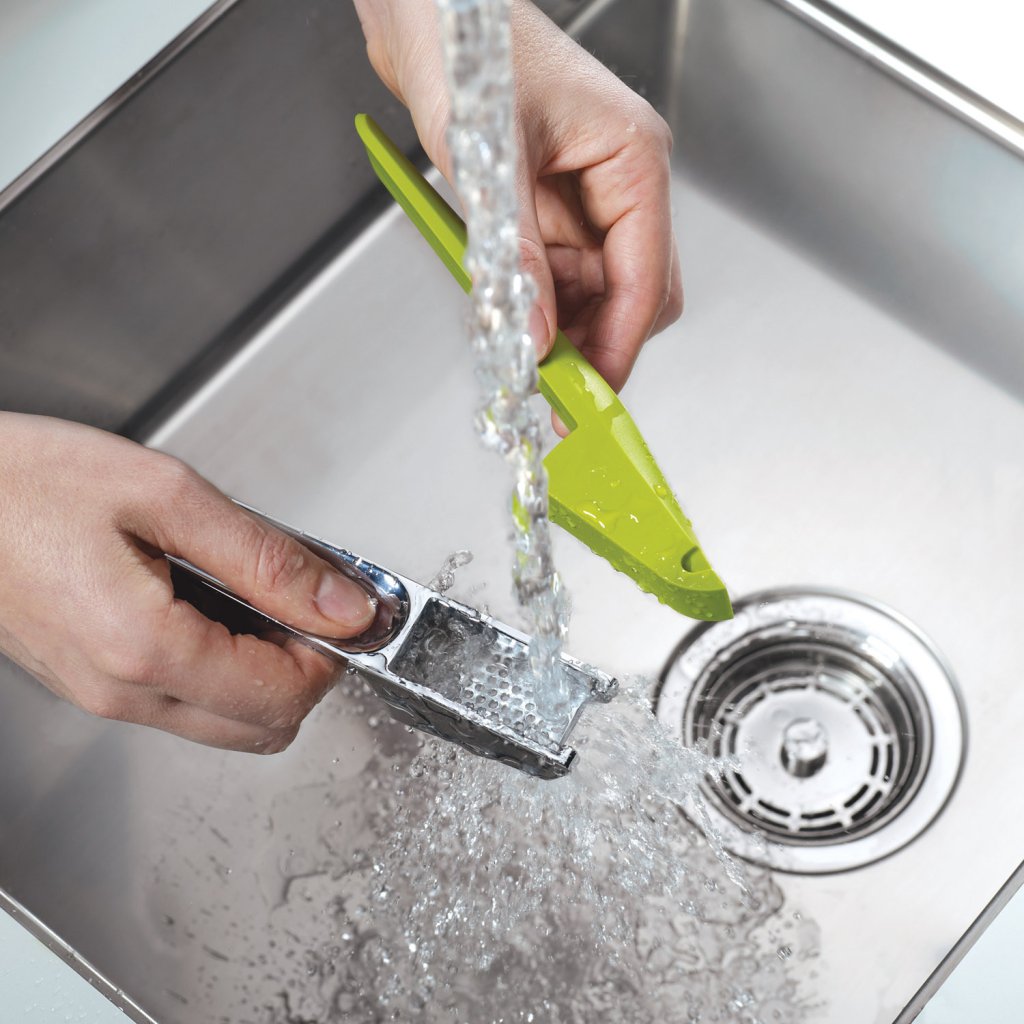 Für viele von uns ist es unumgänglich, sich von einem Klassiker in Form einer traditionellen Hebel-Knoblauchpresse zu trennen. Die Designer von Joseph Joseph haben diese Situation perfekt gemeistert. Die Clean-Press ist auf den ersten Blick nicht überraschend, aber der Schein kann trügen. Nach getaner Arbeit kann man ihn leicht in zwei Teile brechen und mit dem scharfkantigen Kunststoffgriff den Rest des gepressten Knoblauchs aus der Presse schaben. Das spitze Ende des farbigen Griffs reinigt auch das Innere der Presse von Rückständen. Zum Schluss spülen Sie die Presse einfach unter fließendem Wasser ab oder stellen sie in die Spülmaschine. Das Innere der Ballenpresse hat abgerundete Ecken, damit der Abfall nicht stecken bleibt.