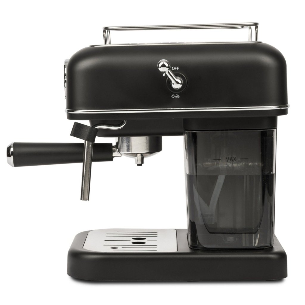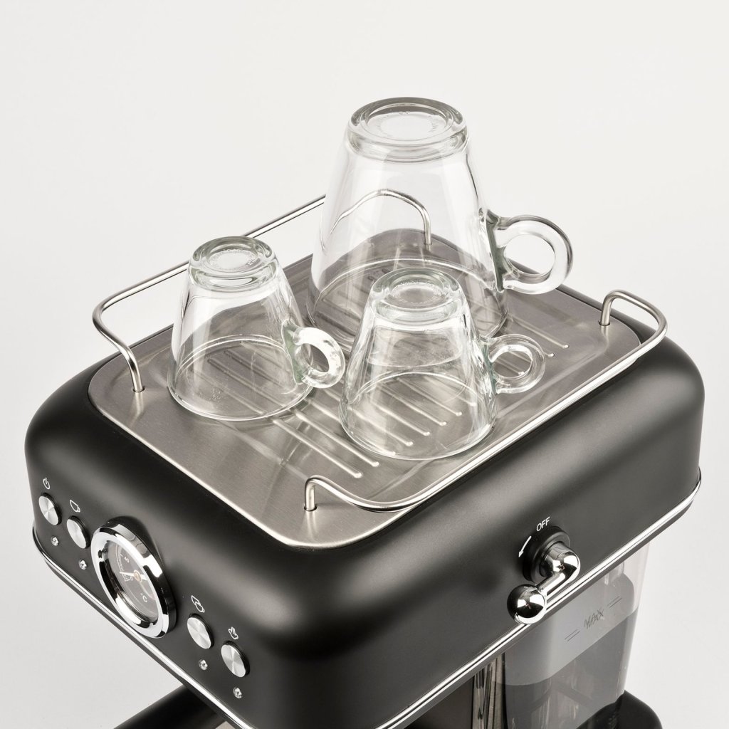 - mattschwarze Oberfläche mit Edelstahldetails und Retro-Bedienelementen wirkt elegant und stilvoll