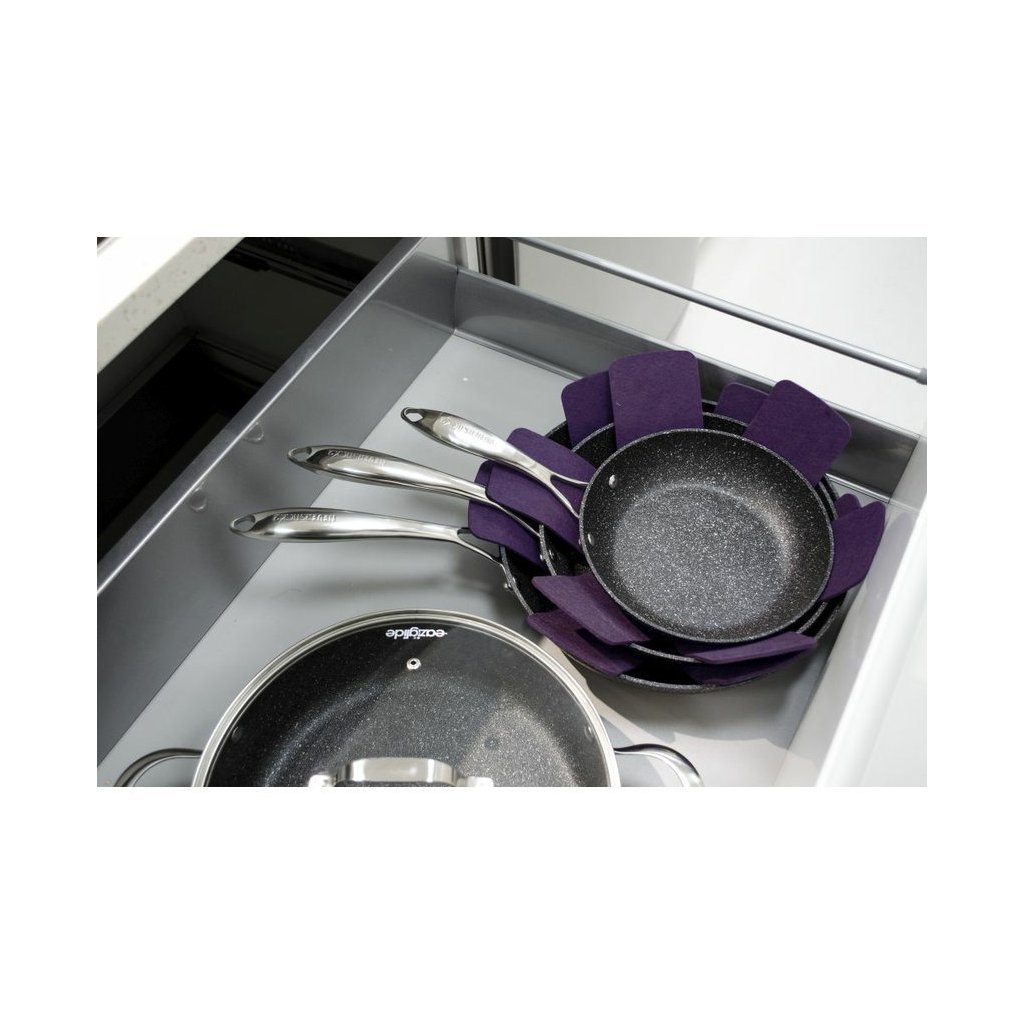Die Einlagen zwischen den Pfannen schützen Ihr Kochgeschirr vor Kratzern und Abnutzung, wenn Sie die Pfannen übereinander aufbewahren. Die Einlage bildet eine weiche Schutzschicht zwischen den Pfannen . Die Einsätze sind groß genug, um auch die größten Geschirrteile aufzunehmen.