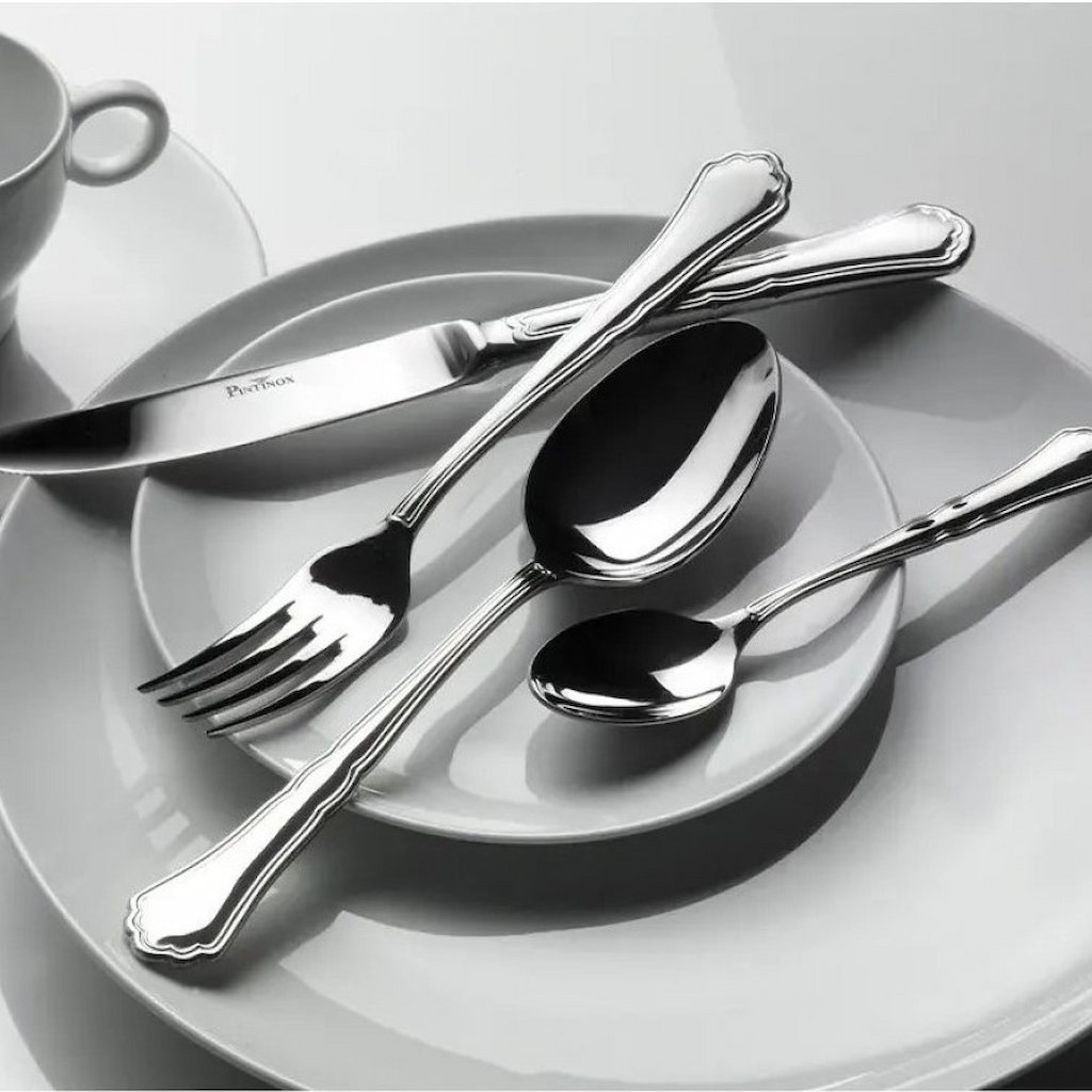 - Die dekorativen Linien am Griff bilden subtile Ornamente, die den klassischen Charakter des Bestecks unterstreichen