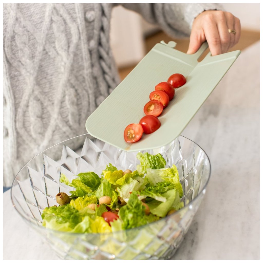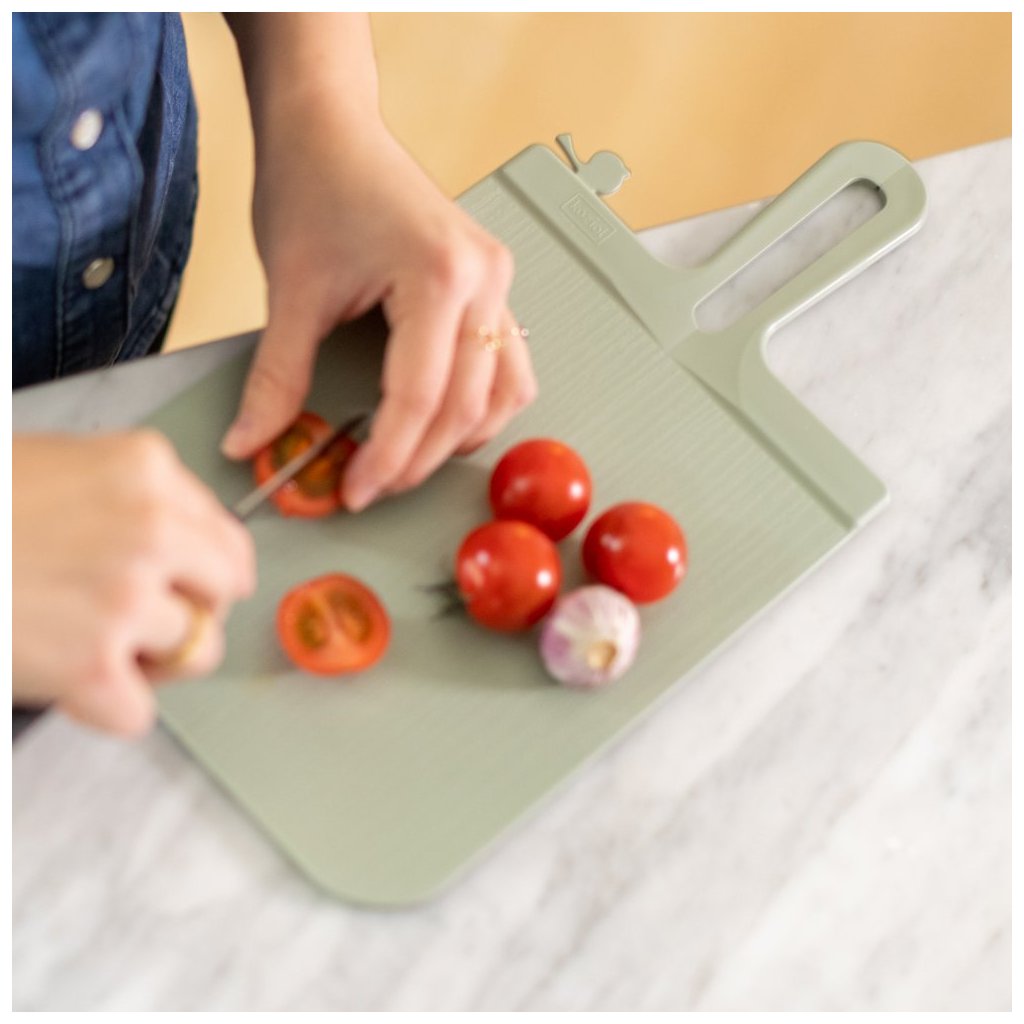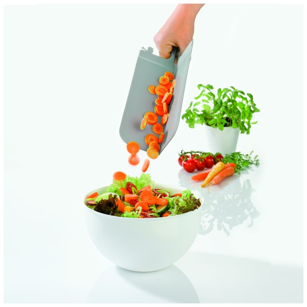 - der Griff hält das zusammengeklappte Schneidebrett im richtigen Winkel