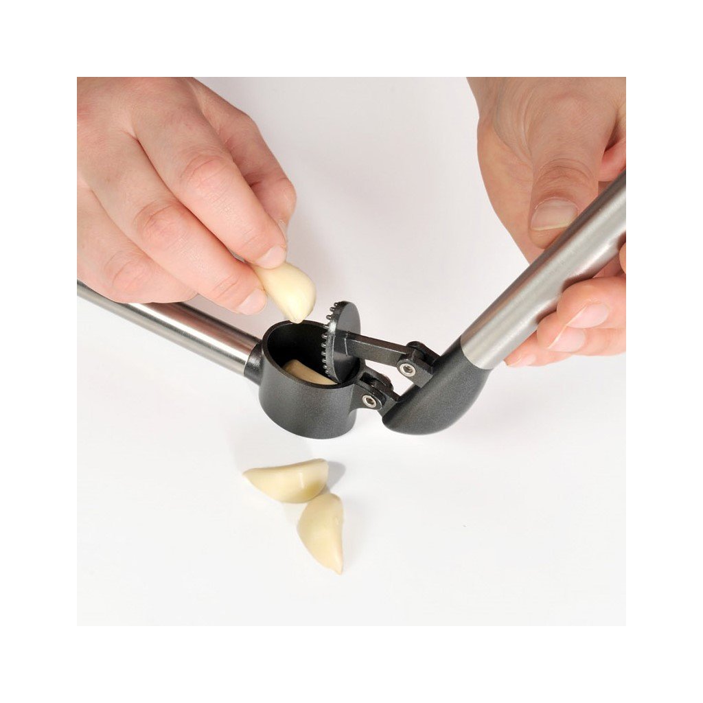 Die robuste Knoblauchpresse des deutschen Traditionsherstellers WMF mit einem Funktionsteil aus Aluminiumguss mit Antihaftbeschichtung presst mühelos Knoblauchzehen in wenigen Augenblicken. Der runde, massive Griff aus 18/10 Cromargan®-Edelstahl liegt gut in der Hand und die richtige Ergonomie garantiert eine reibungslose Handhabung. Legen Sie die geschälte Knoblauchzehe in die Presse und dann drücken Sie herunter. Gepresster Knoblauch setzt ein Enzym frei, das sich Studien zufolge positiv auf die Durchblutung auswirkt.