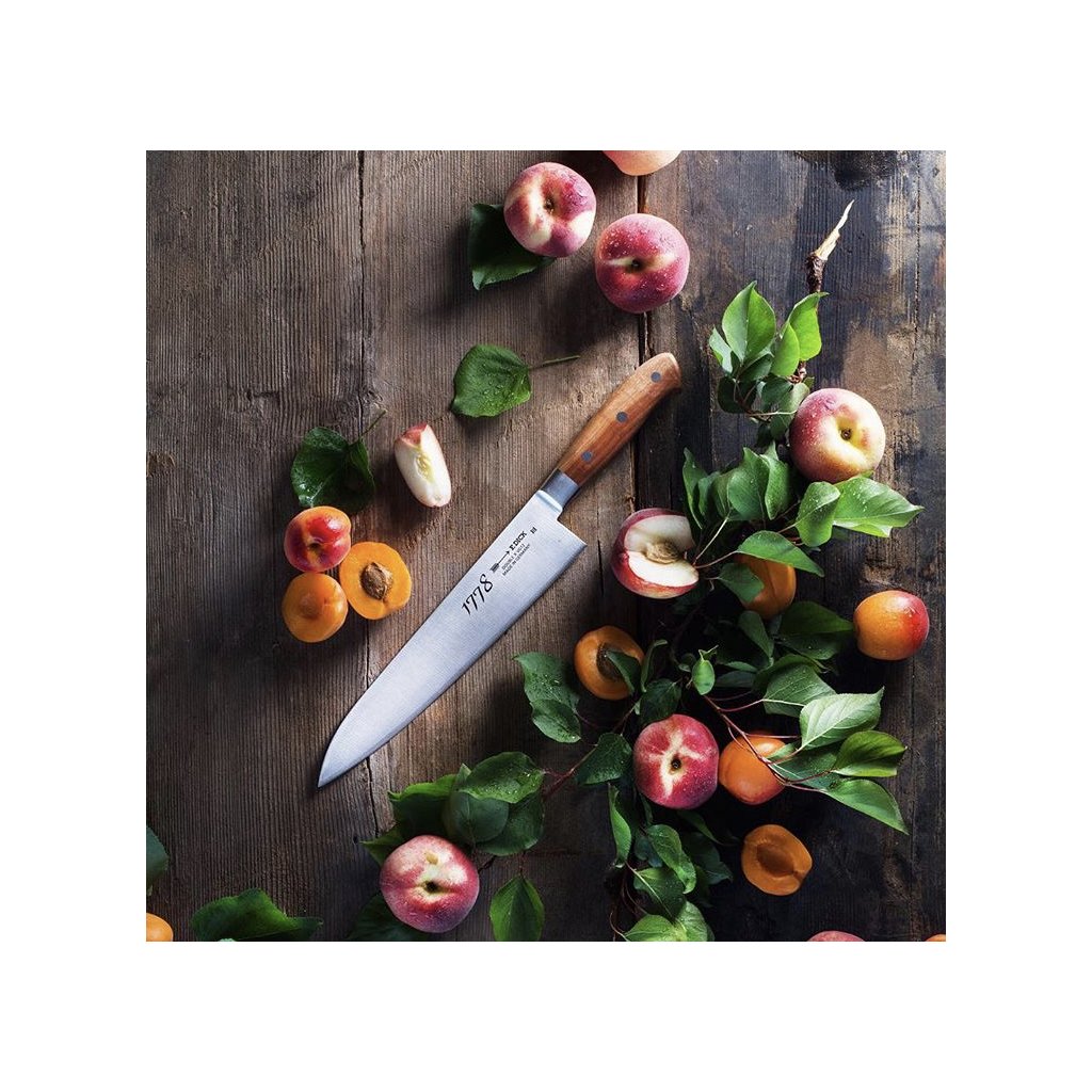 Geschmiedete, limitierte Jubiläumsserie: Der Kern der Messer dieser außergewöhnlichen Serie besteht aus sehr dünnen Schichten hochlegierten "Double X VG 12" Kohlenstoffstahls mit extremer Härte von 61˚ HRC. Das Ergebnis ist ein besonders effizienter Schnitt und eine deutliche Verlängerung der Lebensdauer der Klinge. Der geschichtete Edelstahlkern ist lebensmittelecht. Alle Messer der Serie 1778 werden von Hand geschliffen und abgerichtet, und auch der Griff und die Klinge werden von Dick-Spezialisten gefertigt.