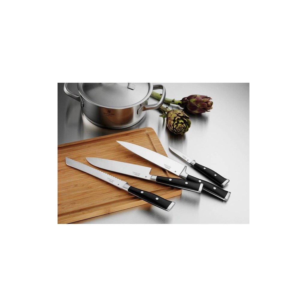 Grand Class Messer verbinden die Tradition der geschmiedeten Premium-Messer mit dem genieteten Griff der Marke WMF und zeitgenössischem Design. Die Messerklingen sind aus hochwertigem Spezialmesserstahl gefertigt. Sie werden mit der neuesten Performance-Cut-Fertigungstechnologie hergestellt. Das Ergebnis sind sehr scharfe Messer, die unempfindlich gegen Beschädigungen und Brüche sind und ihre Schärfe sehr lange beibehalten. Die Lebensdauer der Messer ist sogar doppelt so lang, wie es die Normen verlangen.