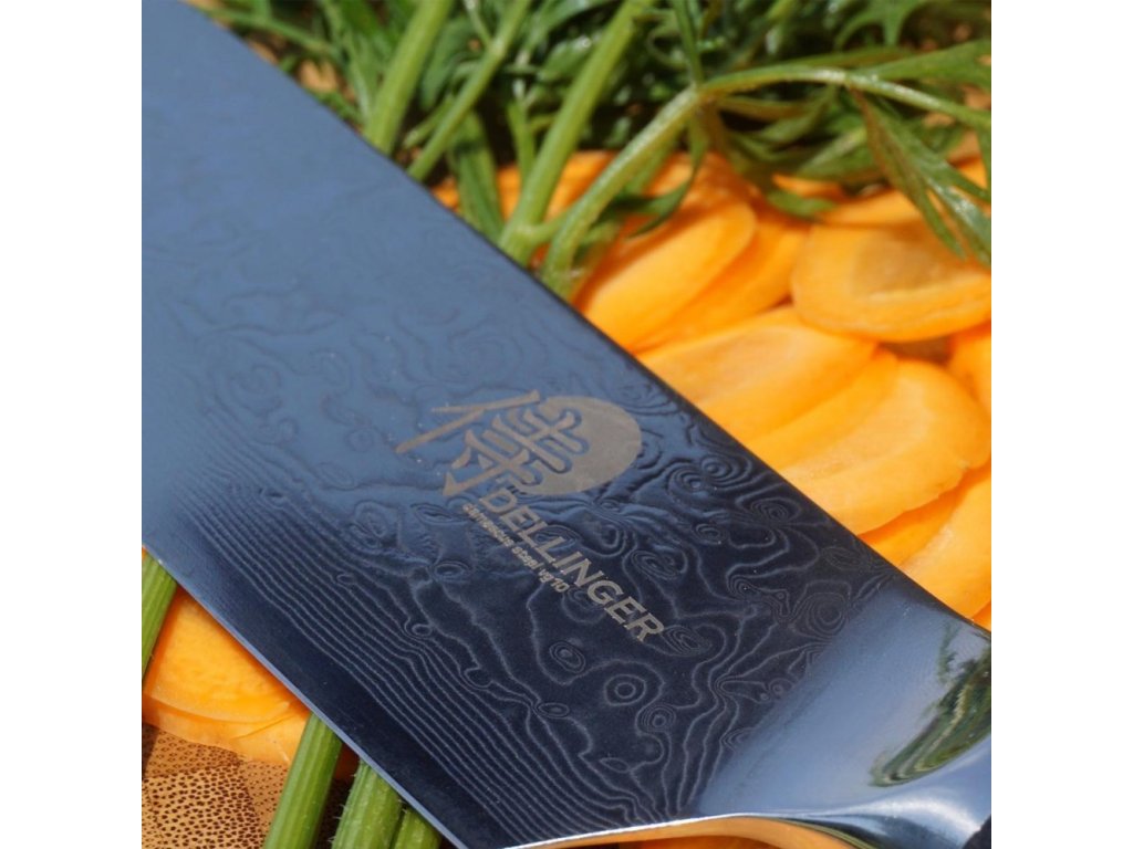 Robustes, sehr scharfes und schweres japanisches Messer GYUTO / Chef 8" Dellinger Samurai (Klingenlänge 200 mm) aus Damaststahl mit beeindruckendem Design und höchster Qualität. Der Messerrücken und die Klinge verjüngen sich zu einer Spitze für vielseitigen Einsatz von außergewöhnlicher Schneidkraft.