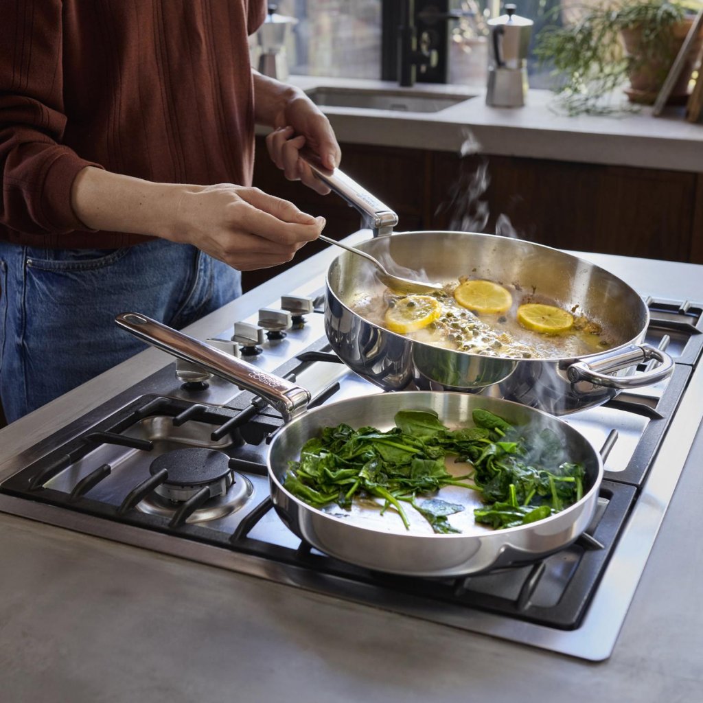 - Die robuste dreischichtige Konstruktion kombiniert eine polierte Edelstahlaußenfläche, einen Aluminiumkern für gleichmäßige Wärmeverteilung und eine innere Edelstahlschicht.