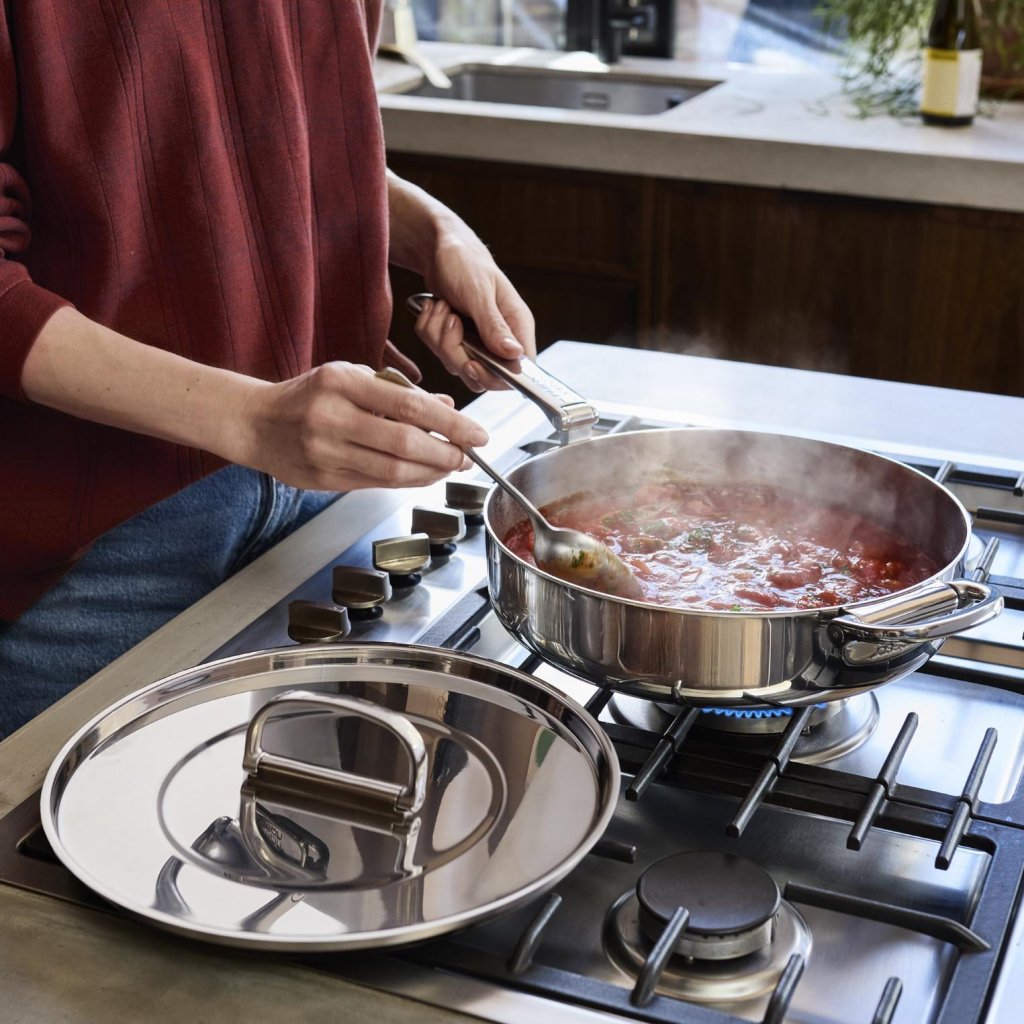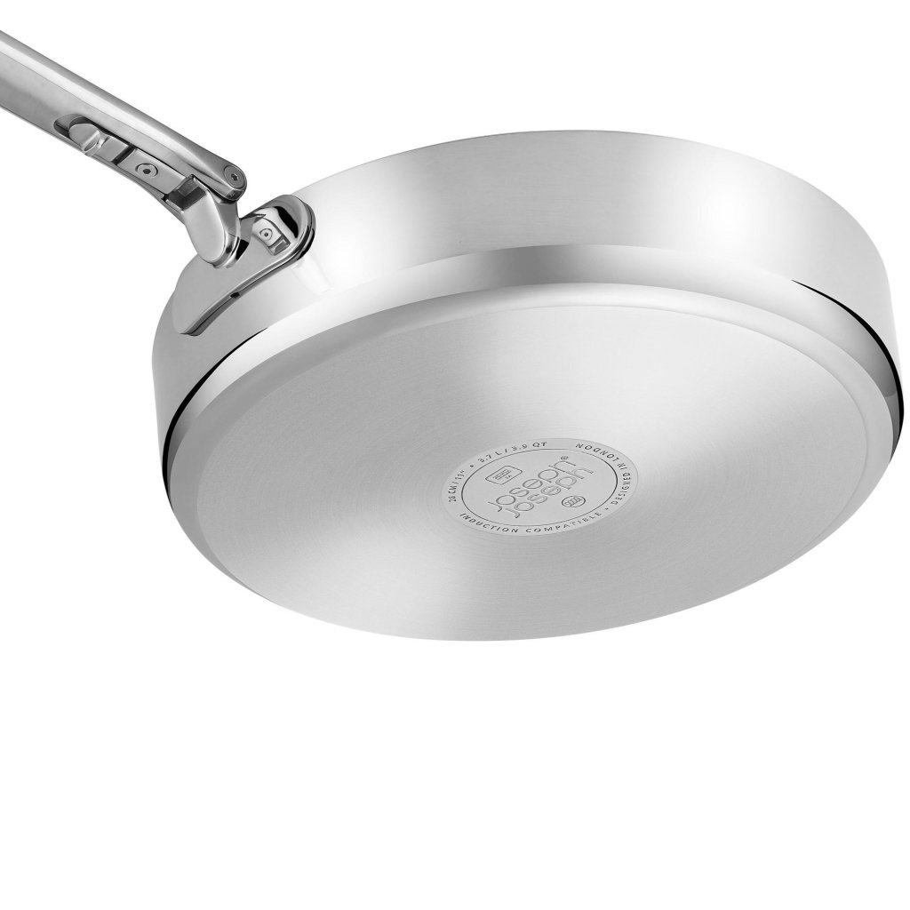 - Die robuste dreischichtige Konstruktion kombiniert eine polierte Edelstahlaußenfläche, einen Aluminiumkern für gleichmäßige Wärmeverteilung und eine innere Edelstahlschicht.