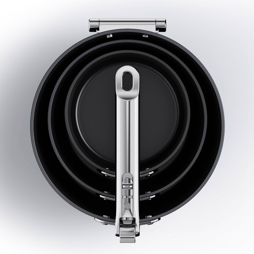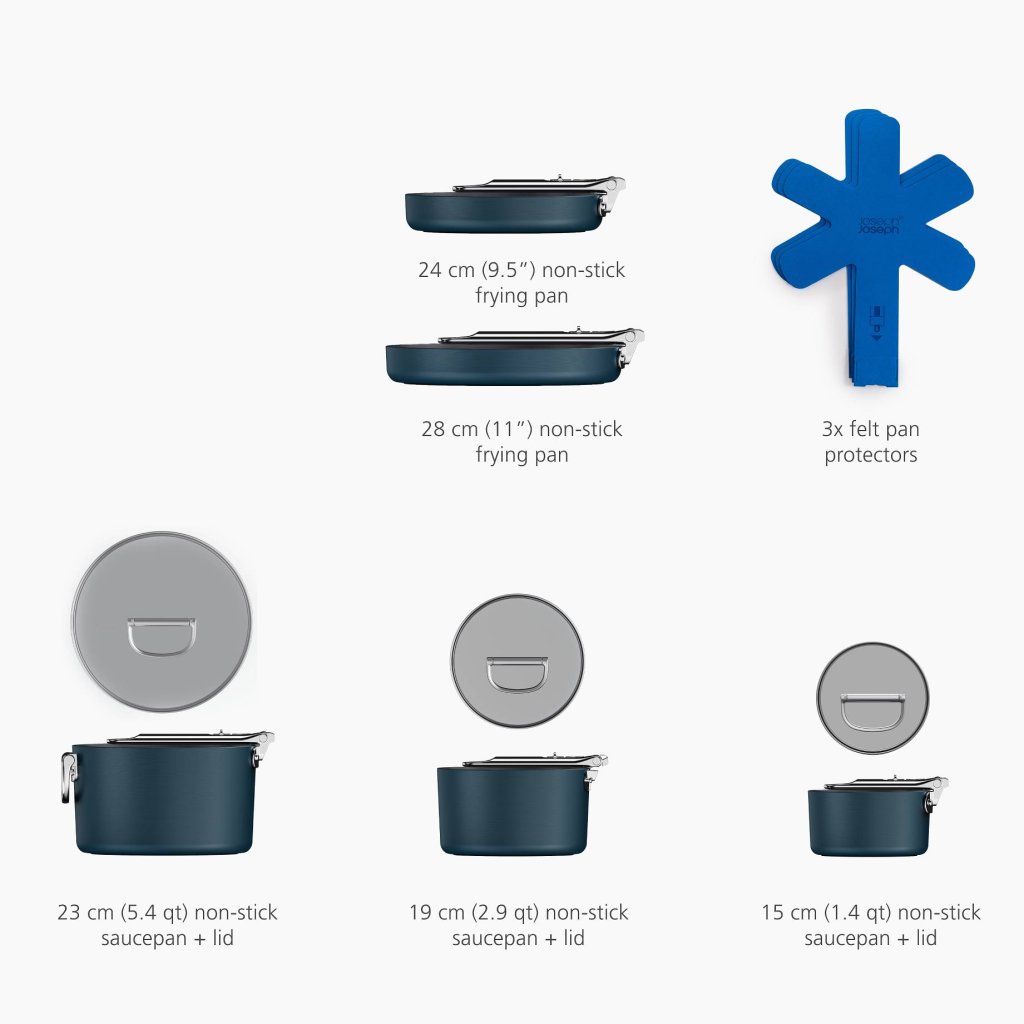 - Dank der klappbaren Griffe lassen sich die einzelnen Teile leicht stapeln und sparen so bis zu 50 % mehr Stauraum als herkömmliches Kochgeschirr.