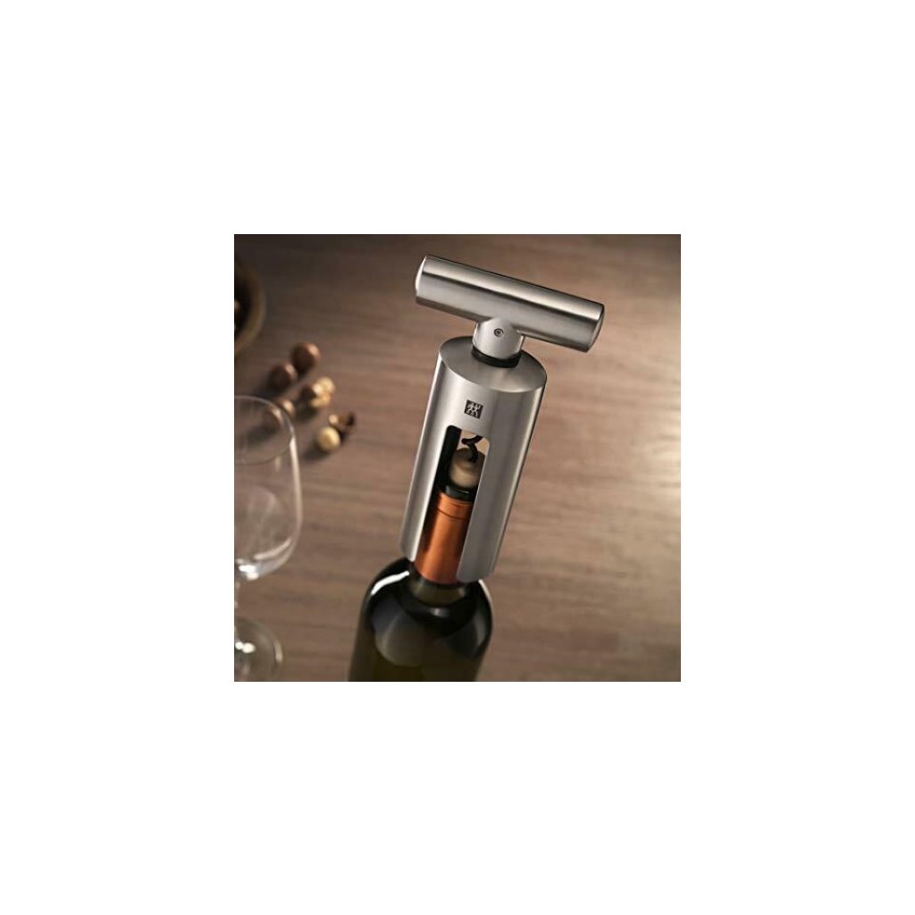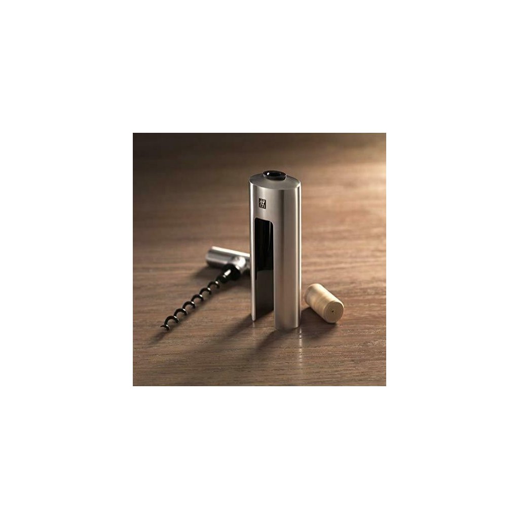 Korkenzieher ZWILLING ® Sommelier von deutscher Firma ZWILLING J. A. Henckels besticht durch sein dezentes, puristisches Design. Sie werden die Vorteile sofort erkennen, wenn Sie es ausprobieren. Es ist so einfach zu bedienen! Sie setzen den Korkenzieher auf den Flaschenhals und drehen den ergonomisch geformten Griff, um den Korken herauszuziehen. Der Korkenzieher trifft immer in der Mitte des Korkens, so dass Sie nicht Gefahr laufen, den Korken durch falsches Anvisieren zu halbieren. Dank der Antihaftbeschichtung des Bohrers lassen sich auch widerstandsfähige Korken leicht durchbohren.