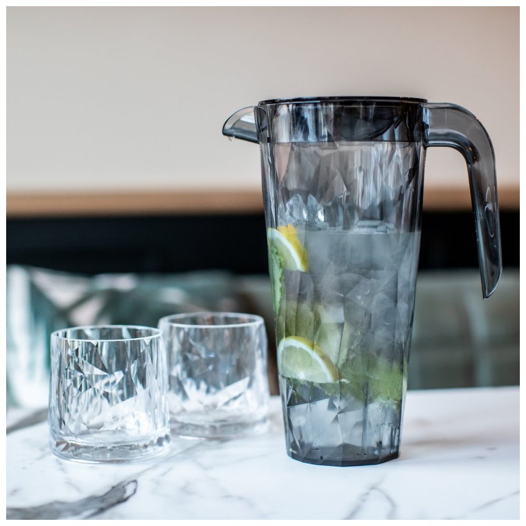 Obwohl er aus transparentem, grauem Kunststoff besteht, sieht er dank der Qualität und Textur des Materials, das an Kristallglas erinnert, sehr elegant aus. Der Krug CLUB wirkt nicht nur dezent und liegt gut in der Hand, sondern er ist auch fast unzerstörbar und zerkratzt oder zerbricht nicht, wenn er herunterfällt. Der Krug ist außerdem stapelbar, so dass Sie in der Küche Platz im Regal sparen können, und verfügt über einen cleveren Deckel. Er hat zwei verschiedene Ausgüsse, um Eiswürfel und Zitronenscheiben darin halten, und wenn Sie den Deckel um 90 Grad drehen, können Sie den Krug verschließen, um Wasser, Saft oder Limonade vor Insekten sowie Staub zu schützen.