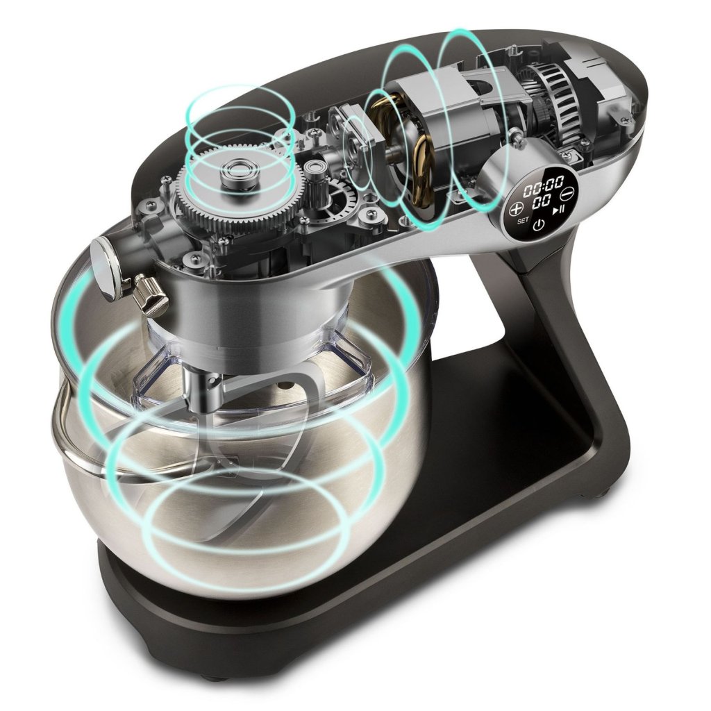 - dank des Planetengetriebes und der direkten Kraftübertragung des riemenlosen Motors kann er größere Teigmengen in kürzerer Zeit verarbeiten