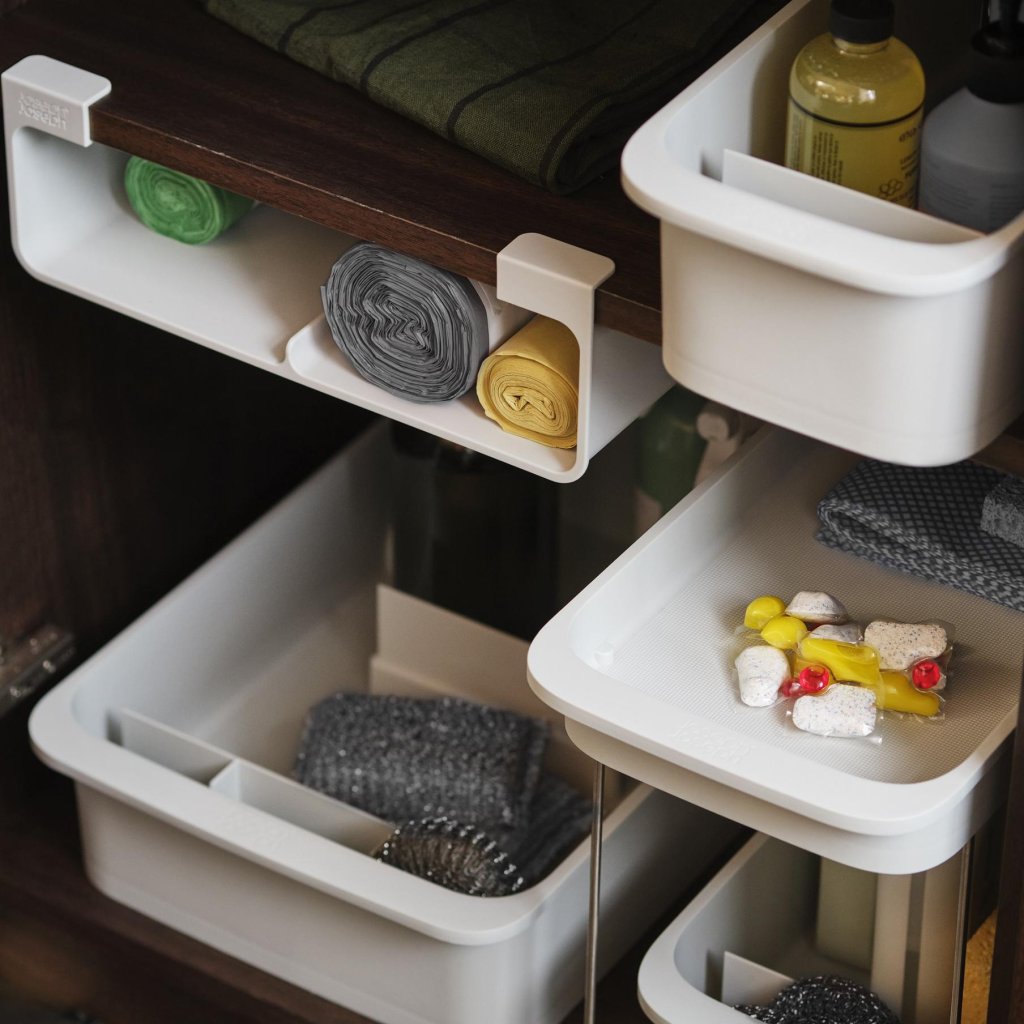 - Das Joseph Joseph CUPBOARDSTORE System hilft dabei, ein übersichtliches System zur Aufbewahrung von Reinigungsmitteln zu schaffen und erleichtert deren tägliche Nutzung.