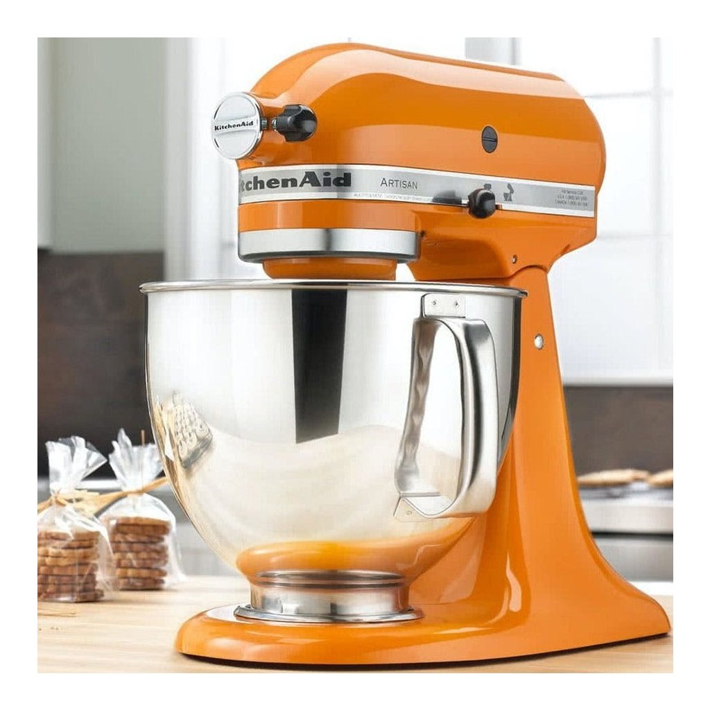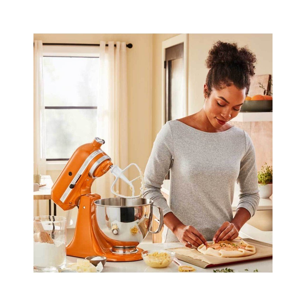 Die Küchenmaschine Artisan Elegance KitchenAid ist ein Gerät mit einer jahrhundertelangen Geschichte, das das Flaggschiff-Produkt der amerikanischen Marke KitchenAid ist. Natürlich hat sich die Küchenmaschine mit schwenkbarem Kopf seit der Einführung ihres Vorgängers im Jahr 1908 weiterentwickelt, aber immer noch beeindruckt sie mit ihrem eleganten Retro-Design. Dank der Auffrischung des Aussehens in Form von einem silbernen Logo auf dem Gerät ist die Küchenmaschine elegant.