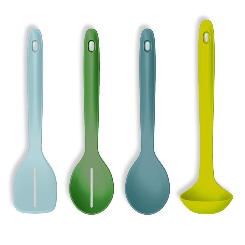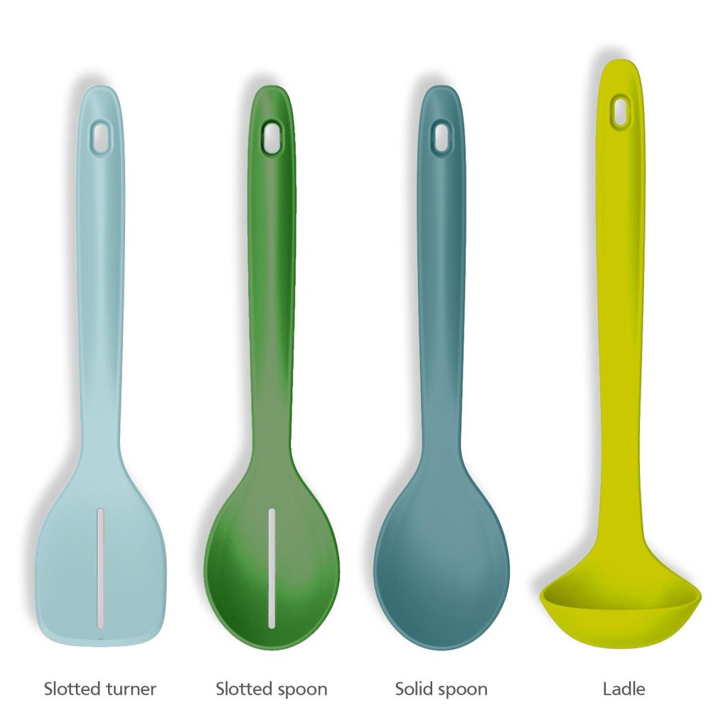 - Das Set enthält einen Schlitzwender, einen gelochten Löffel, einen vollen Kochlöffel und eine Schöpfkelle, sodass es ein breites Spektrum gängiger Küchenaufgaben vom Rühren bis zum Servieren abdeckt.