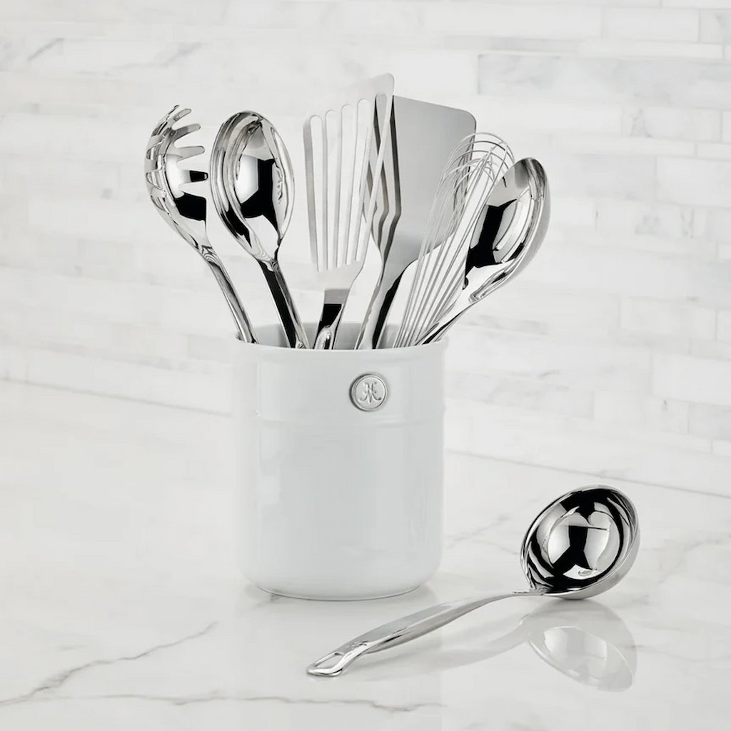 - In der Packung finden Sie einen vollen Löffel, einen gelochten Löffel, eine Schöpfkelle, einen Spaghetti-Löffel, einen vollen Wender, einen Fischwender, einen französischen Schneebesen und einen extra großen Porzellanständer.