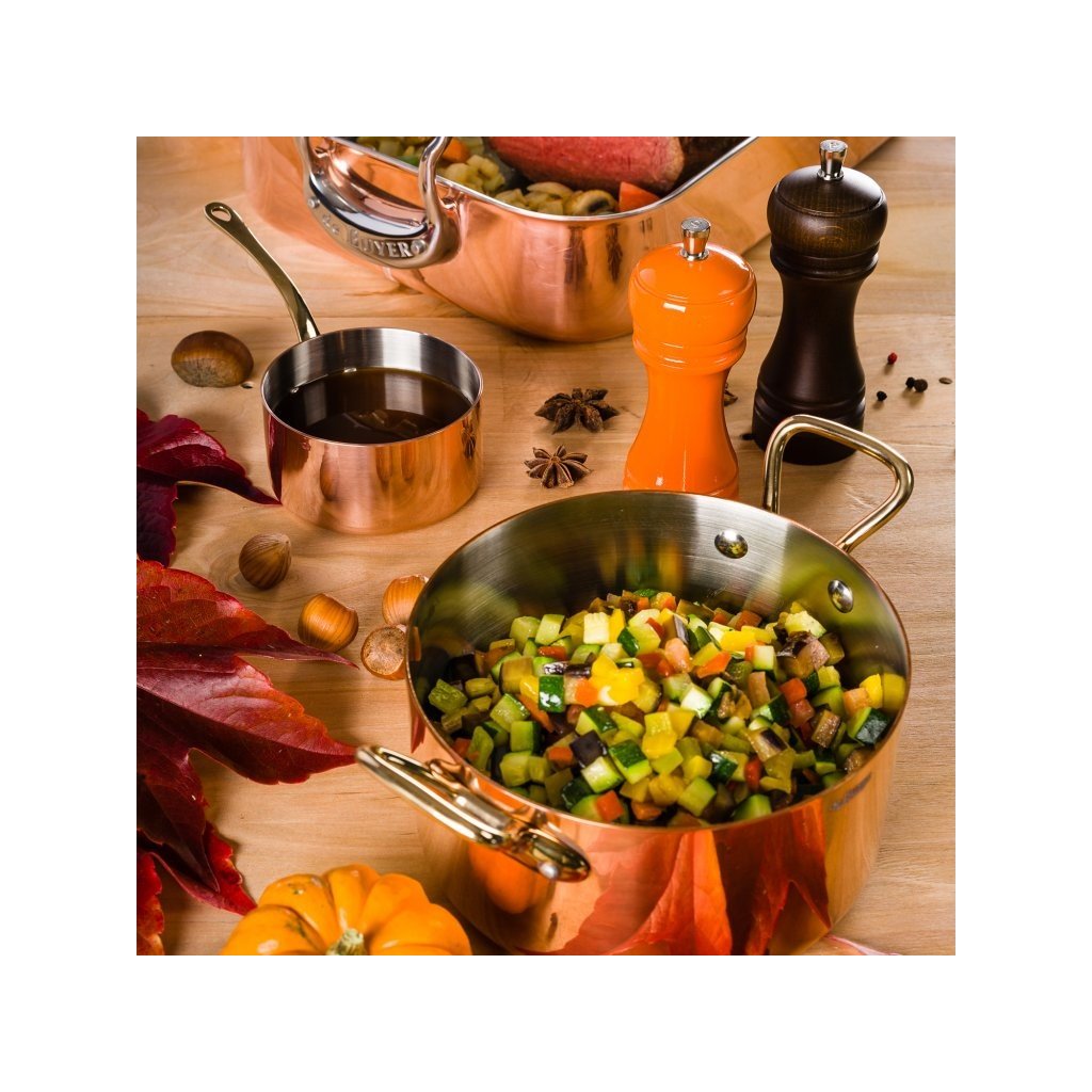 Kochgeschirr aus Kupfer ist der Herrscher in der Küche. Die Vornehmheit von Kupferkochgeschirr liegt nicht nur in seinem luxuriösen Aussehen, sondern vor allem in seiner außergewöhnlichen Wärmeleitfähigkeit. Dieses Material gewährleistet ein schnelles und gleichmäßiges Garen auf der gesamten Oberfläche des Topfes oder der Pfanne. Nicht nur der Boden, sondern auch die Wände werden gleichmäßig beheizt. Kupferkochgeschirr ist unentbehrlich für die Zubereitung von delikaten Gerichten und Soßen, bei denen es auf eine schnelle und effiziente Temperaturkontrolle ankommt.