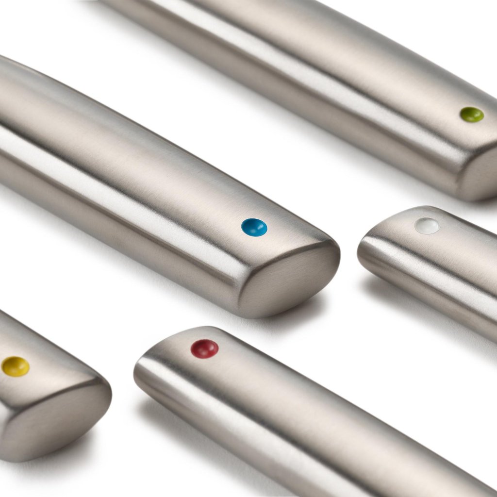 - Jedes Messer hat am Griffende einen farbigen Punkt, der eine schnelle visuelle Unterscheidung der einzelnen Messertypen beim Kochen oder beim Verstauen im Ständer ermöglicht.