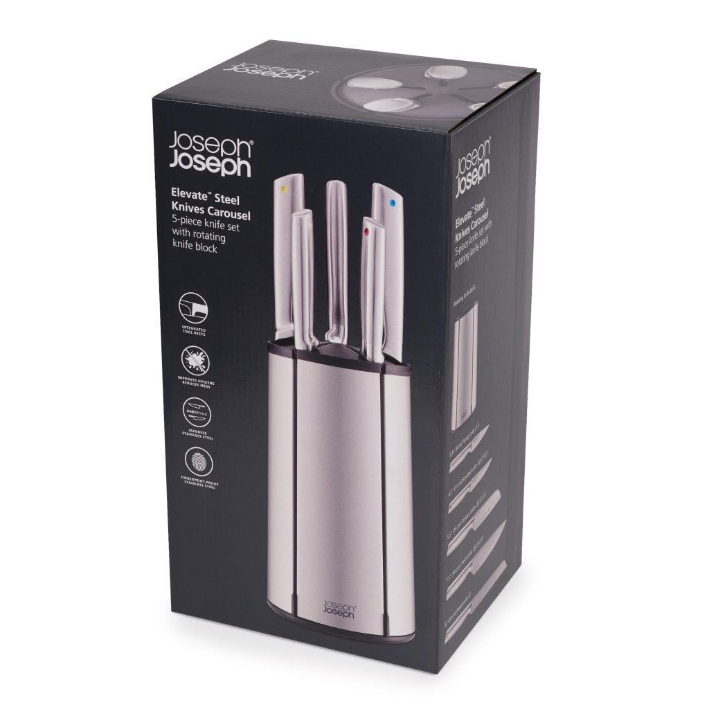 - Das Joseph Joseph ELEVATE STEEL Küchenmesserset mit drehbarem Ständer ist die Komplettlösung für die tägliche Zubereitung von Lebensmitteln, bei der Sie alle wichtigen Messer übersichtlich aufbewahrt und beim Kochen sofort griffbereit haben.