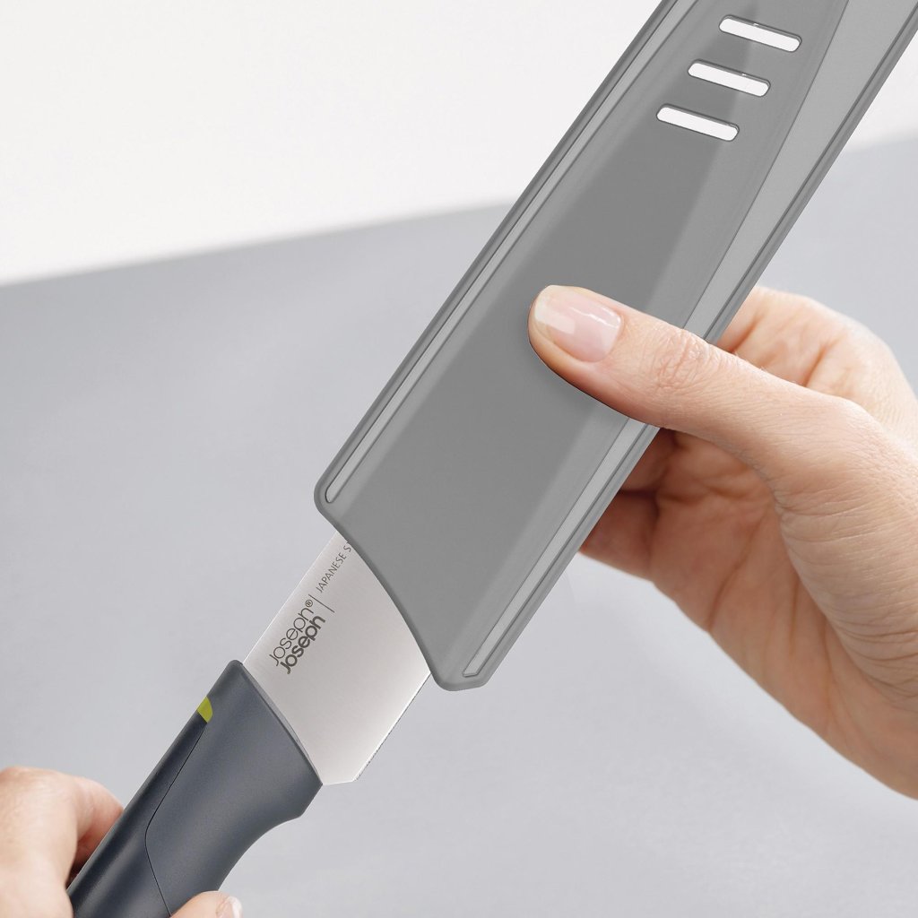 - Die Schutzhülle hilft gleichzeitig, die Messerklinge vor Beschädigungen beim Verstauen in der Schublade zu schützen.