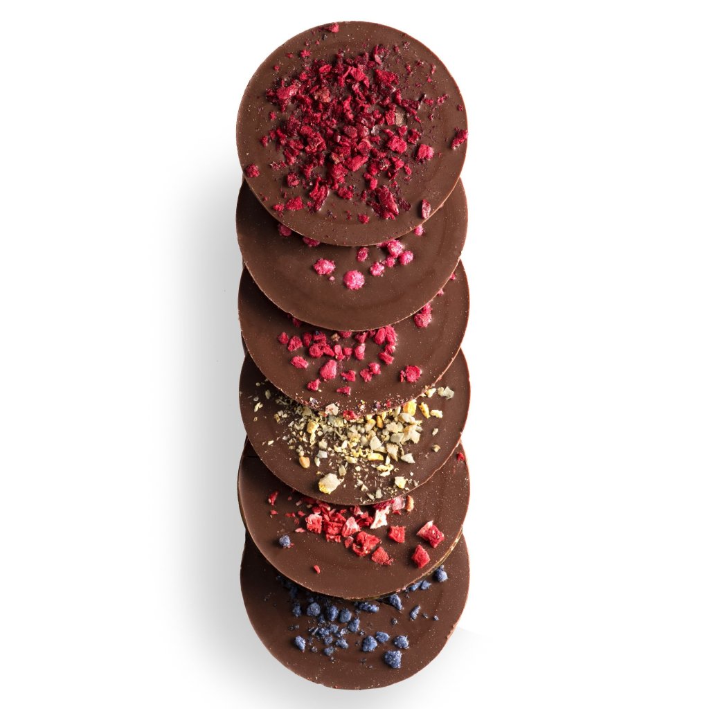 - Zutaten: Milchschokolade - Rohrzucker, Milchpulver, Kakaobutter, Kakaomasse. Emulgator: Sojalecithin. Mögliche Garnierungen: gefriergetrocknete Erdbeeren, Kirschen, Himbeeren, Cranberries, Veilchenblüten in Zucker, Rosenblüten in Zucker und Minzblätter in Zucker. Kann Nüsse enthalten. Gehalt an Kakaotrockenmasse min. 33%.